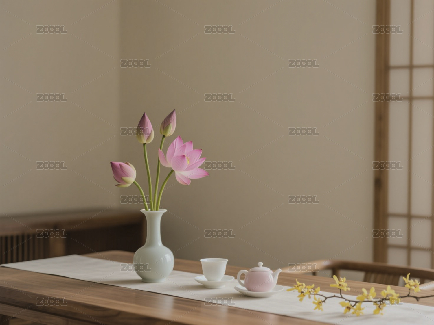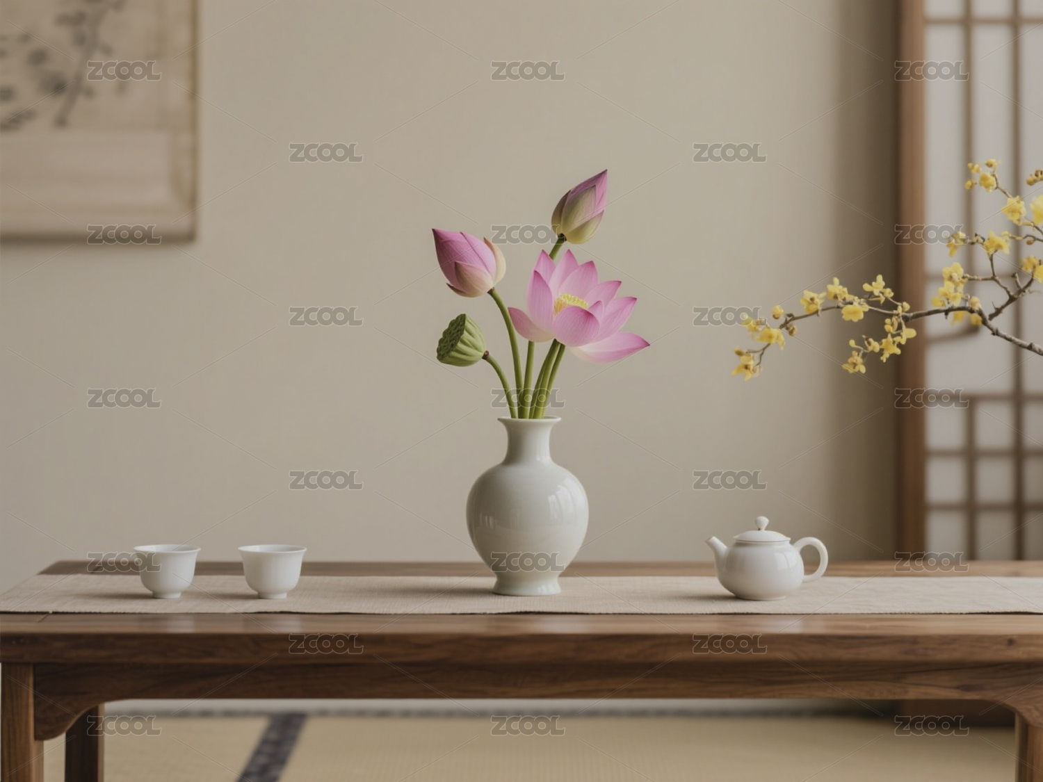 青瓷花瓶插花與桌上的佛手果靜物擺設(shè)