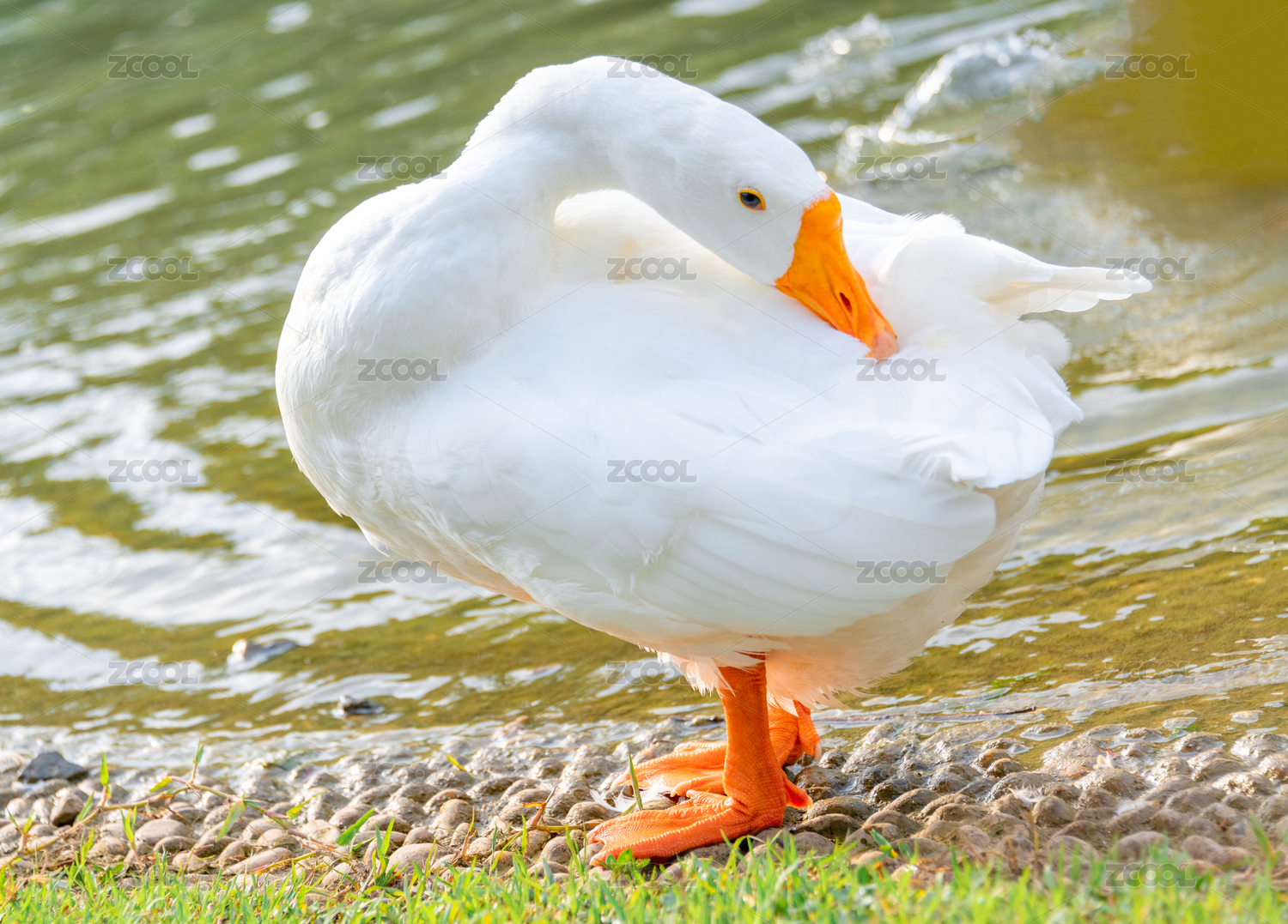 一只白鵝在水邊舒服地清理著羽毛