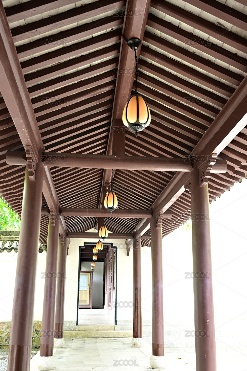 古建筑長(zhǎng)廊懸掛的的燈籠