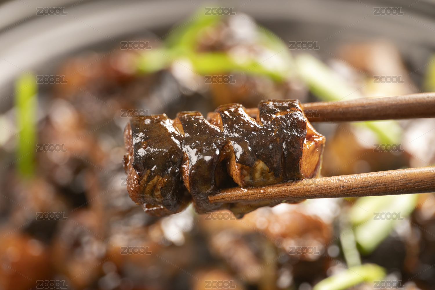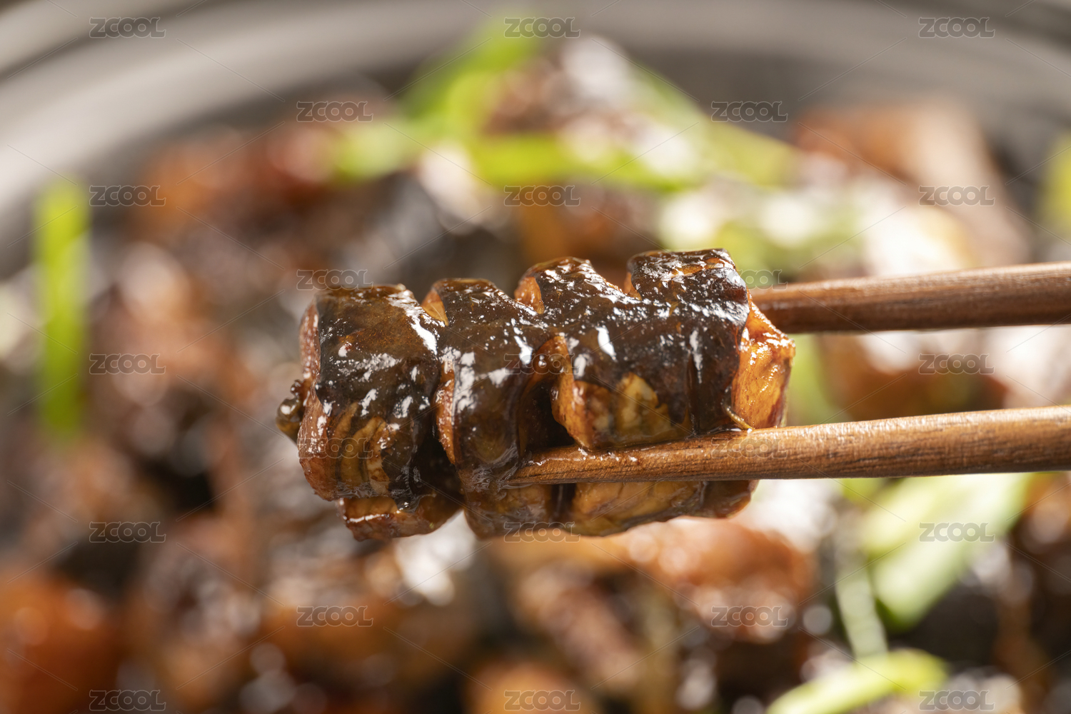 筷子夾起紅燒鱔魚鱔段黃鱔砂鍋黃燜鱔段