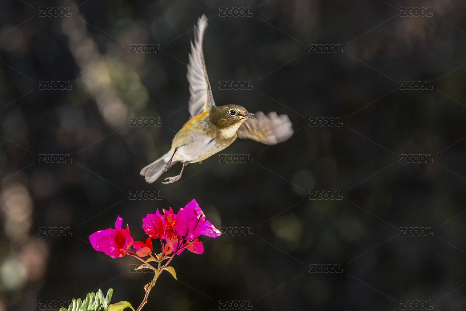 一只紅協(xié)藍(lán)尾鴝鳥飛翔在灌木林間鳴叫覓食