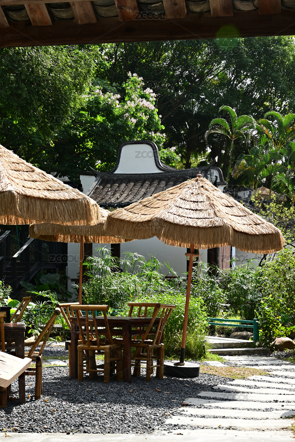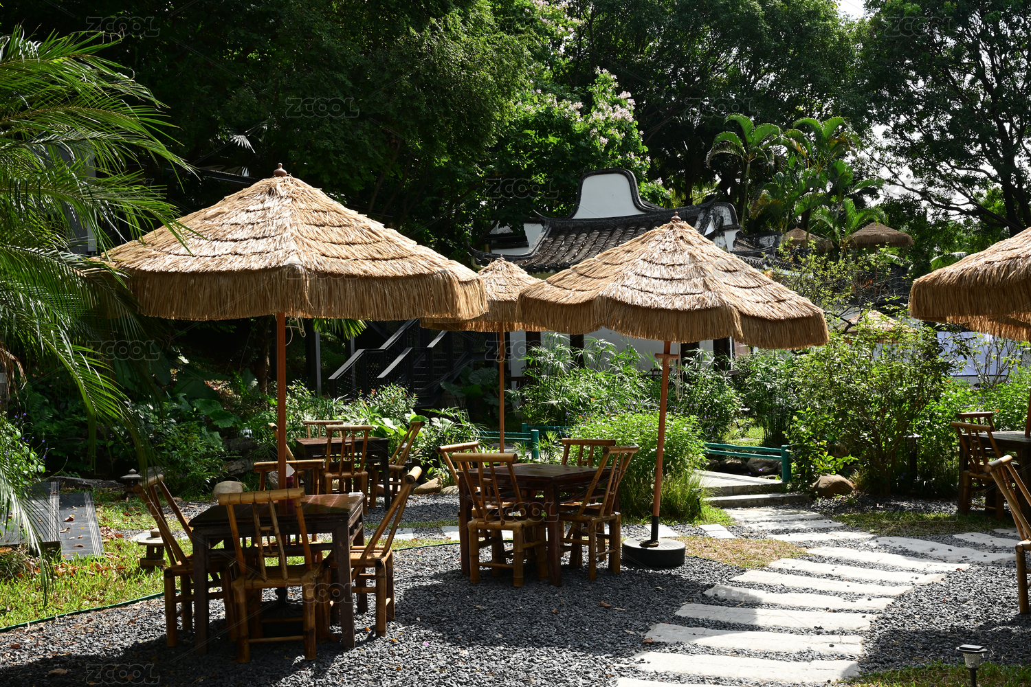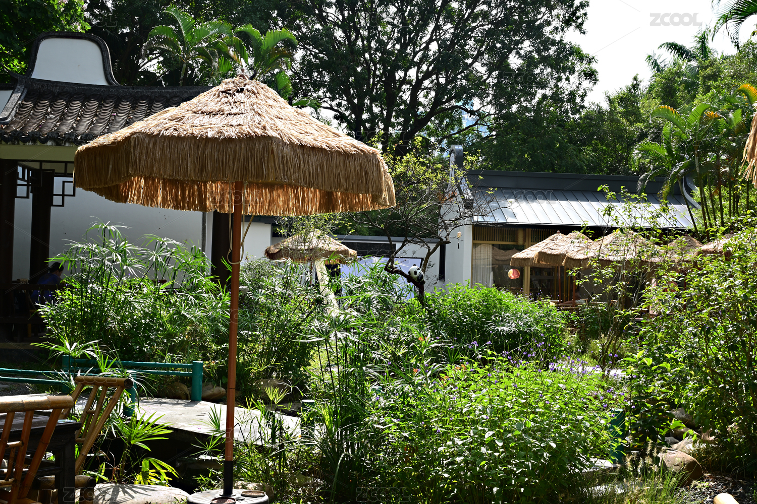 深圳園博園茅草傘下園林庭院休閑茶座景觀