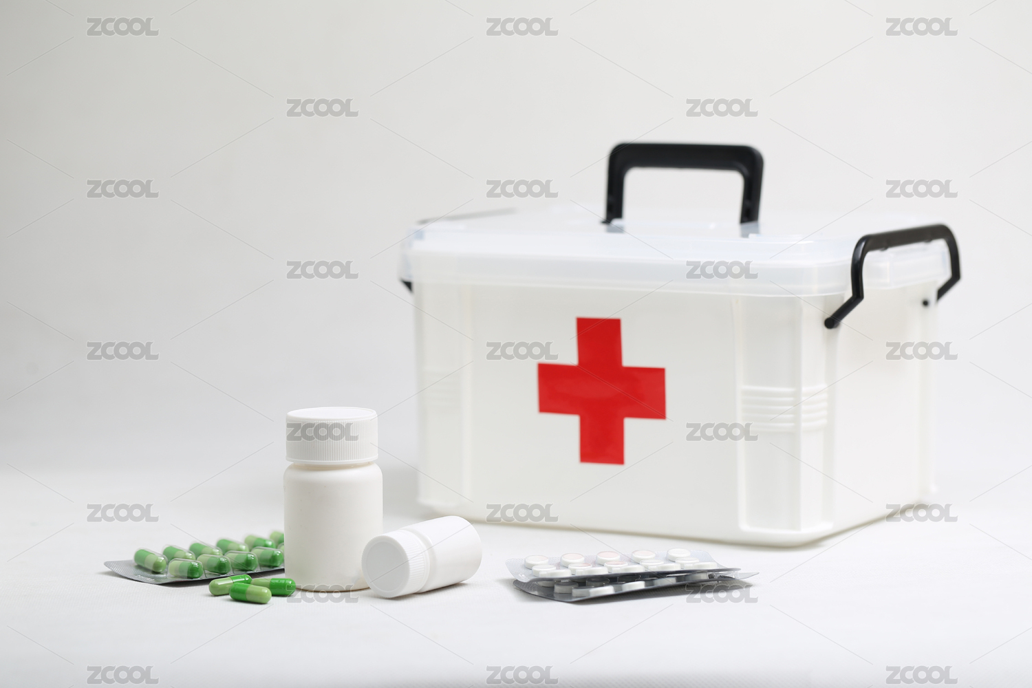 藥瓶和膠囊放在紅十字標(biāo)志的藥箱邊