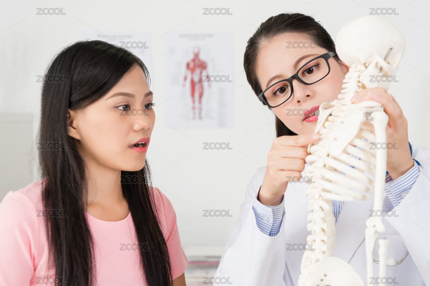 年輕漂亮的醫(yī)療診所的醫(yī)生女人呈現(xiàn)出病人解釋損傷問(wèn)題的骨骼模型的脊骨零件。