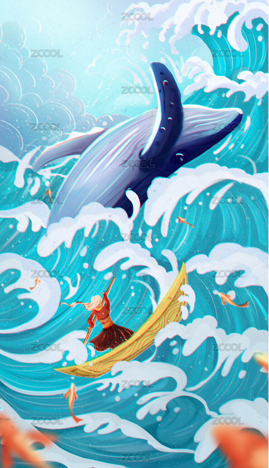 劃著船的女孩和鯨魚在翻涌著的海浪上