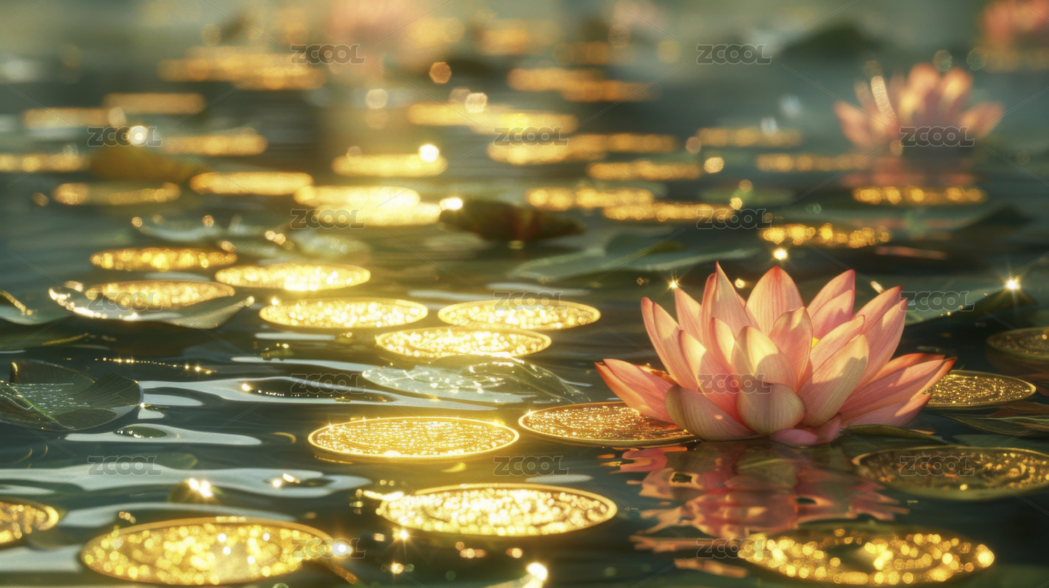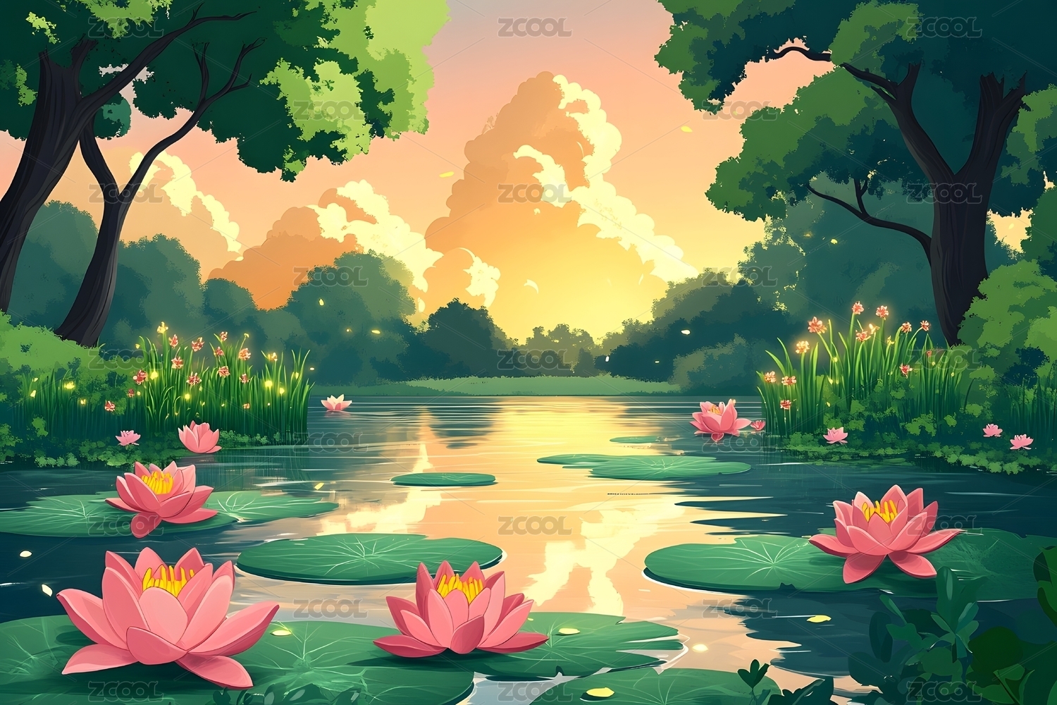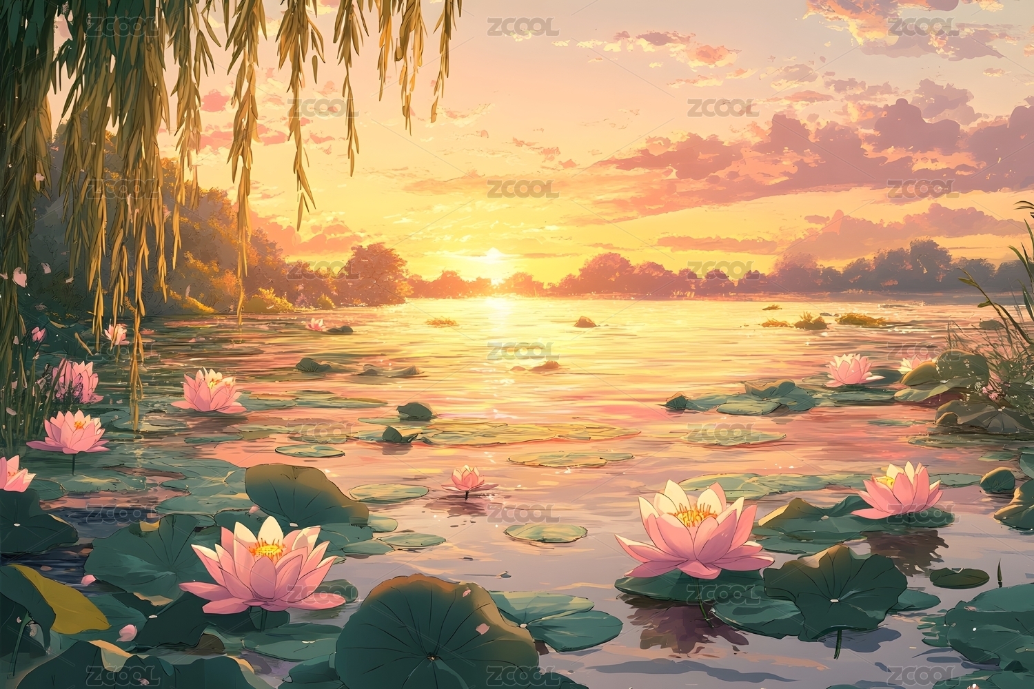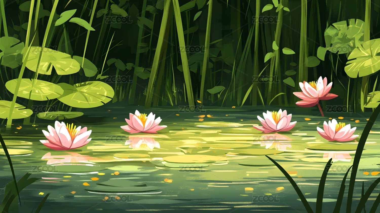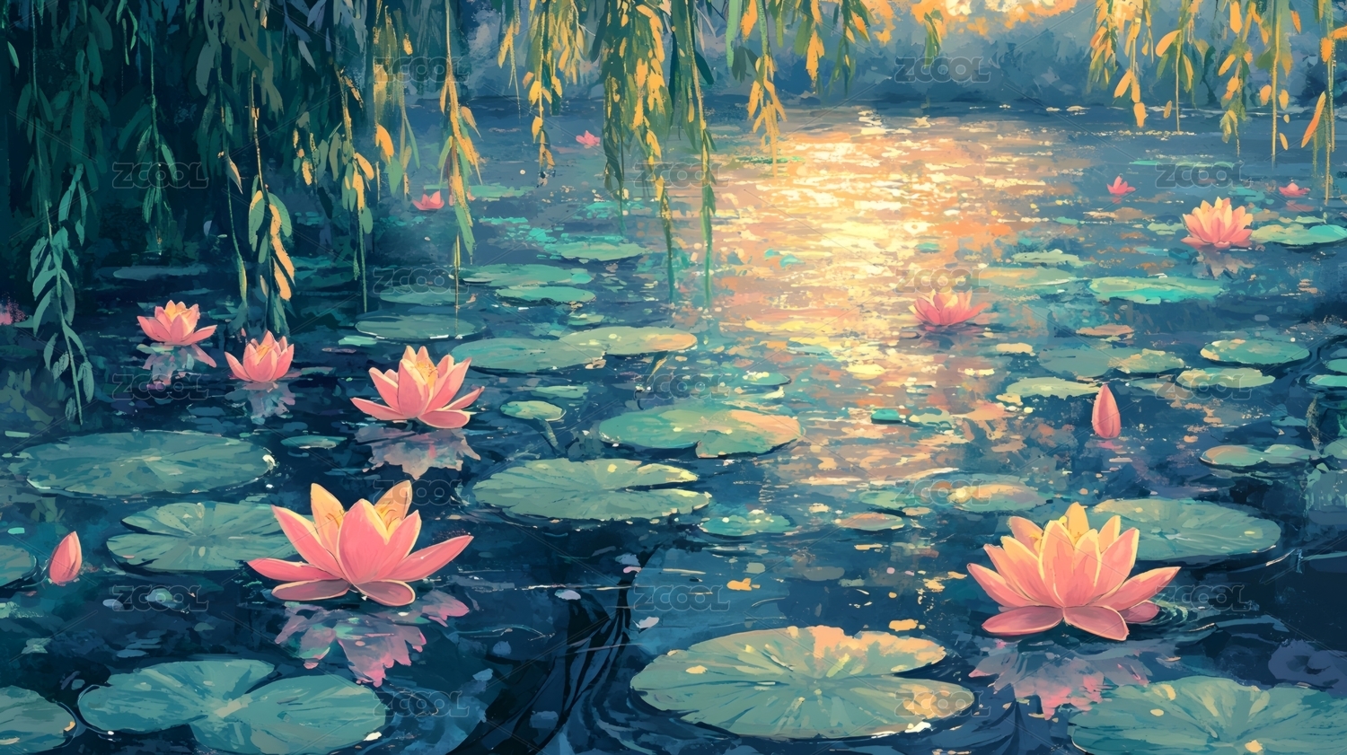 微風(fēng)中的淺草與金色陽光下的睡蓮