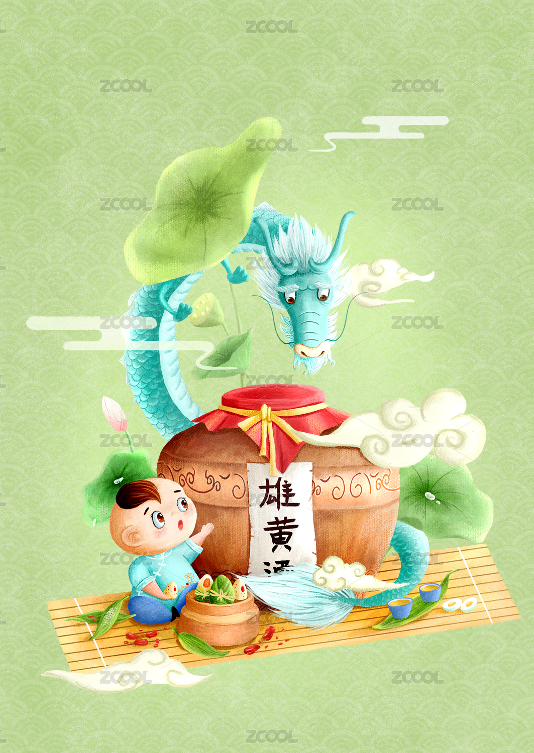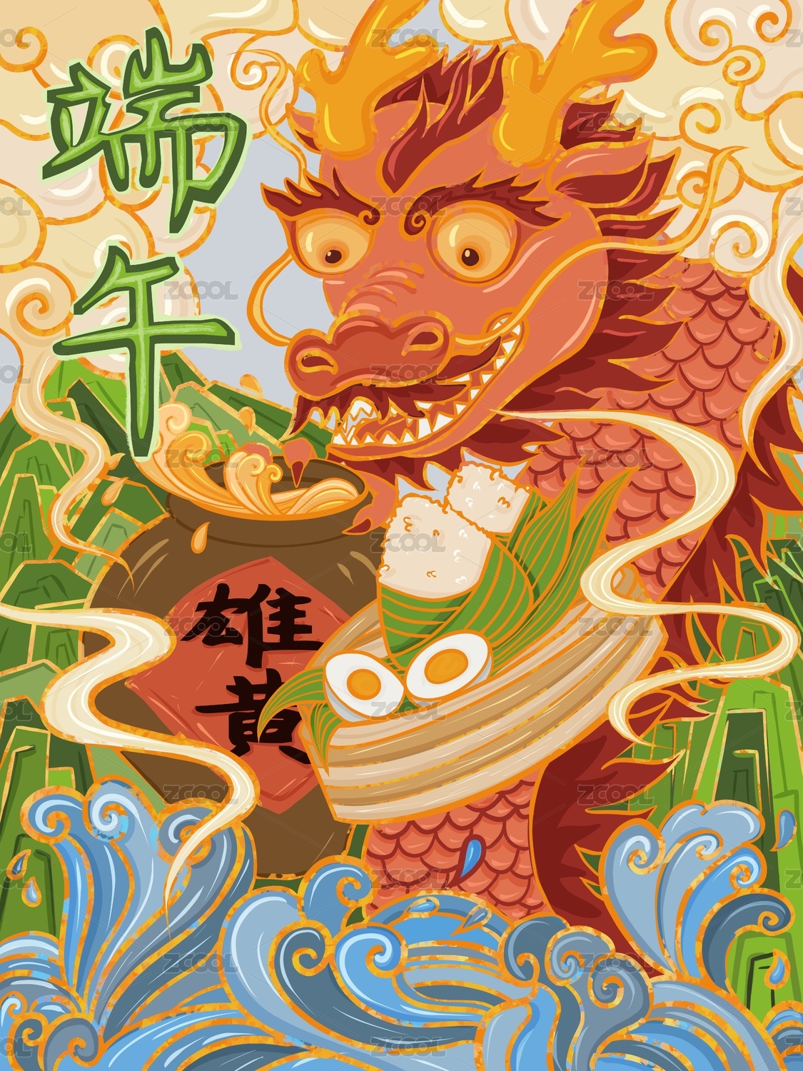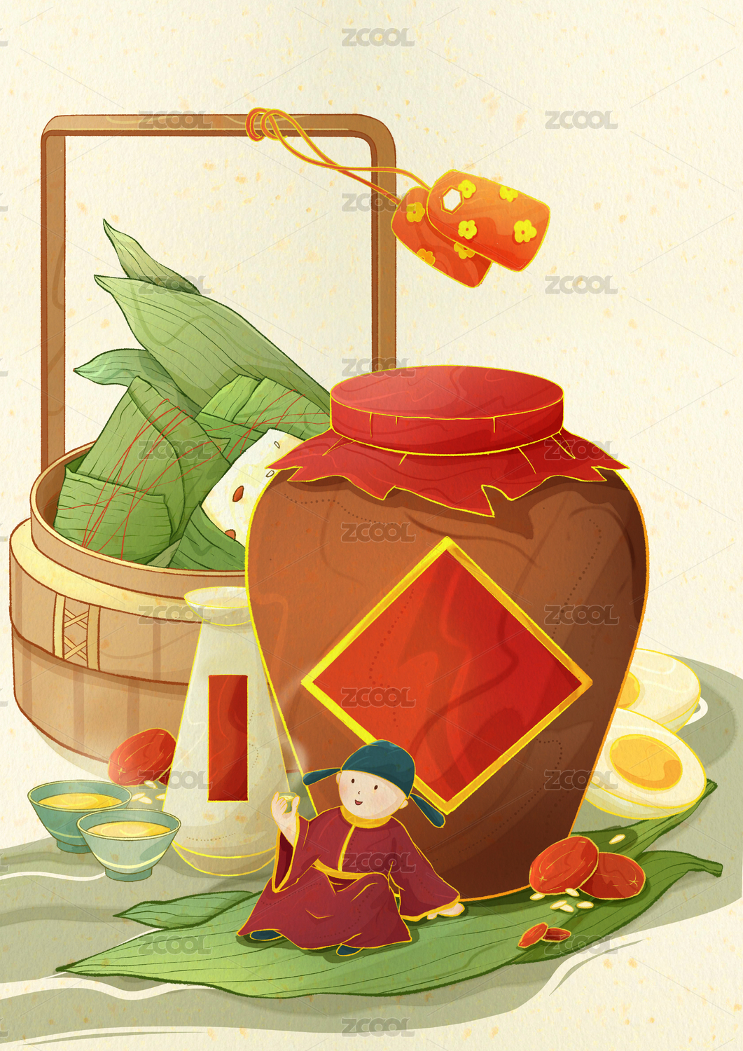 中國(guó)端午節(jié)龍舟粽子雄黃酒國(guó)風(fēng)插畫大圖