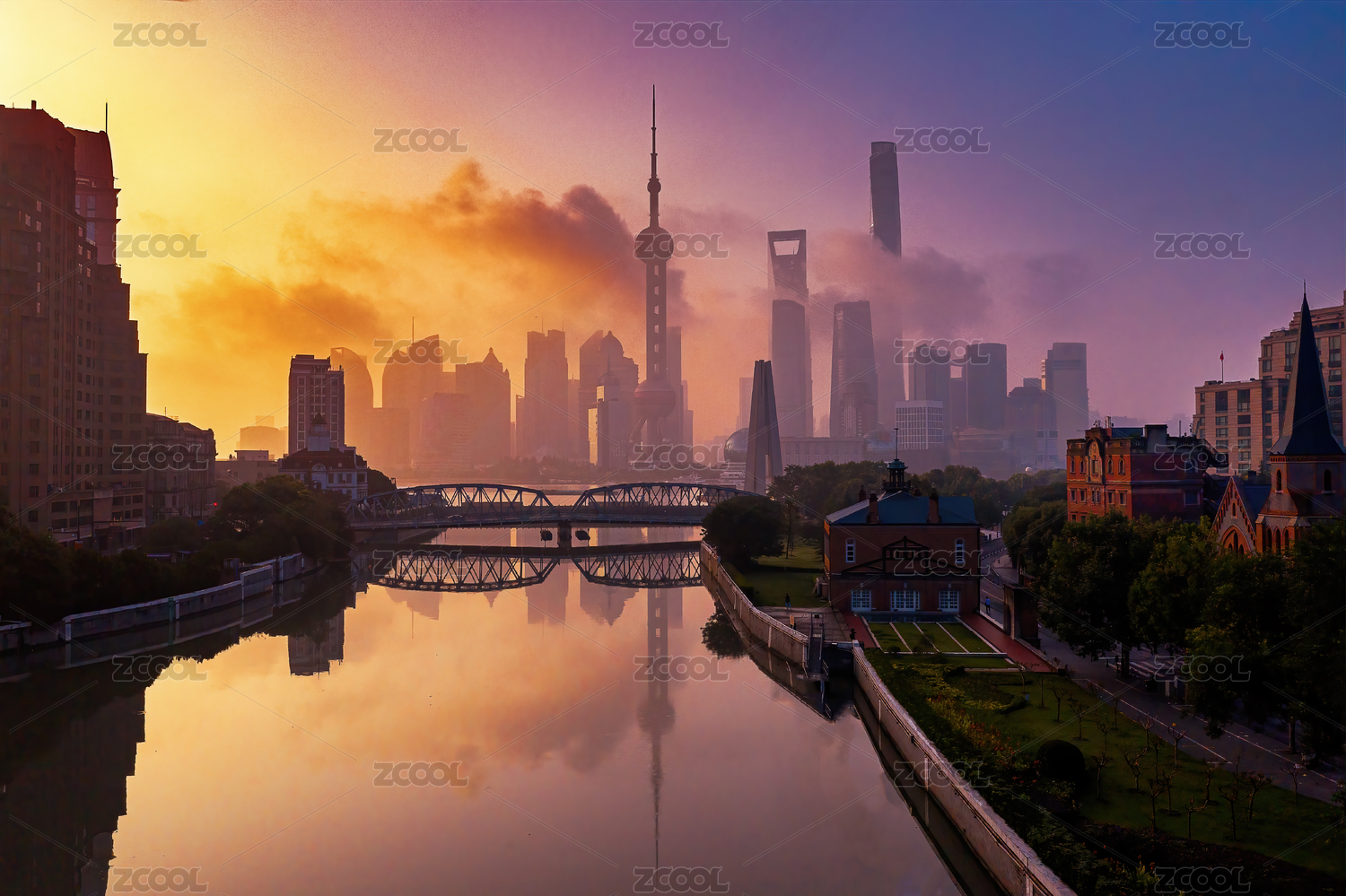上海外白渡橋和陸家嘴建筑群晨曦街景