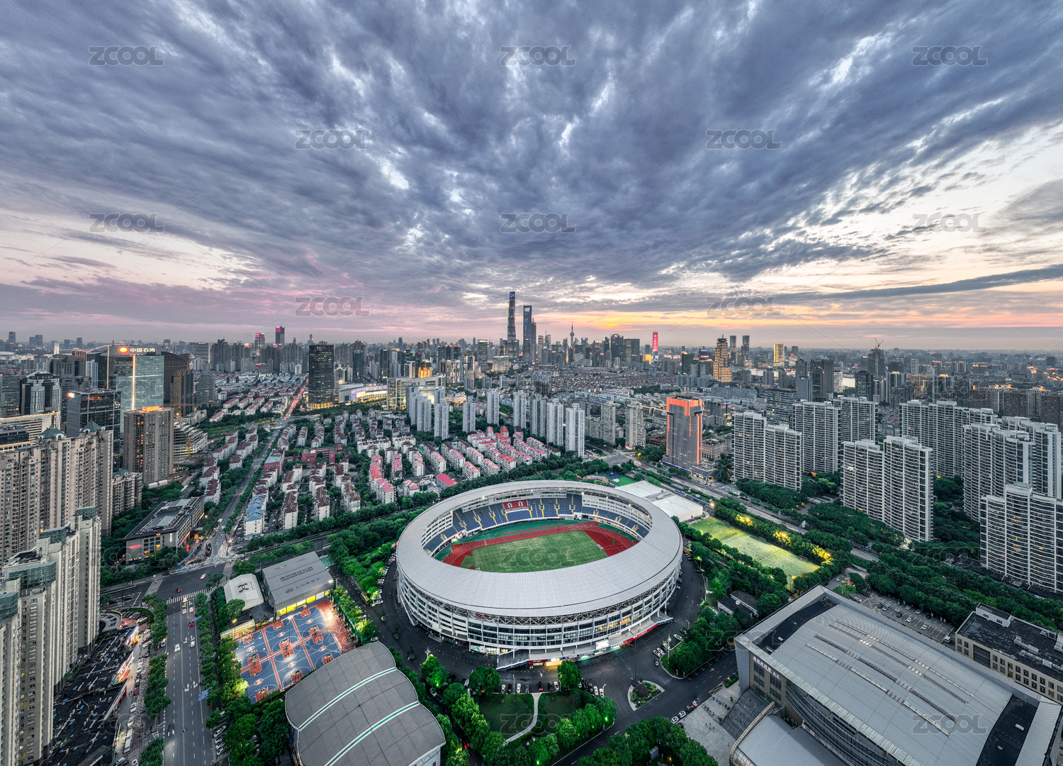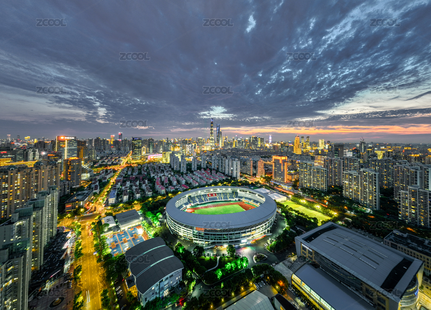 上海浦東源深體育中心體育場(chǎng)足球場(chǎng)館日落藍(lán)