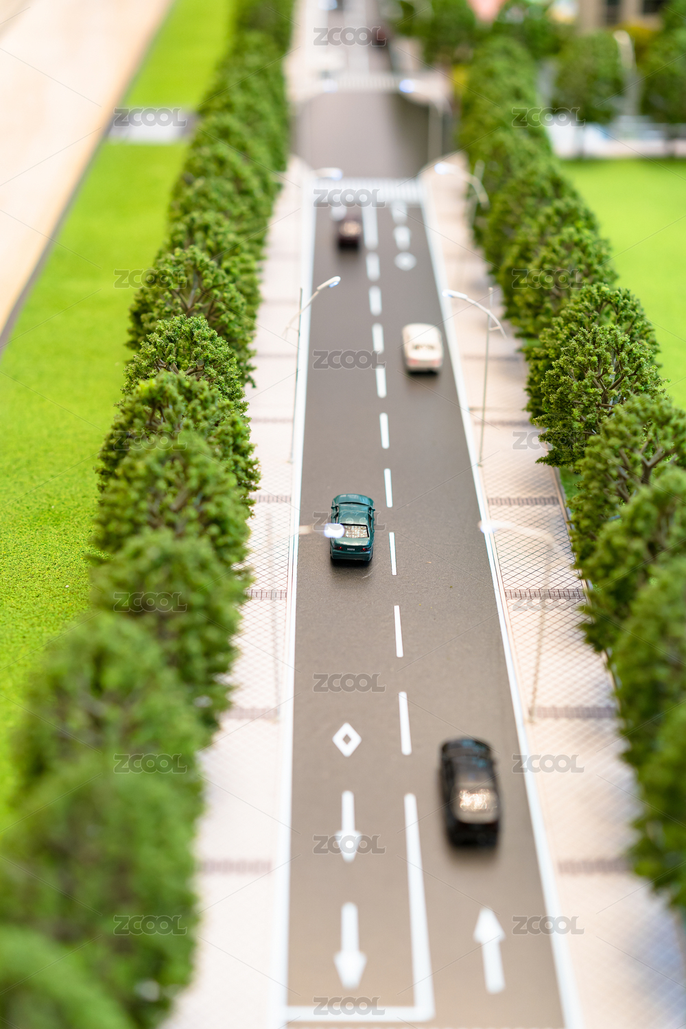 有汽車行駛的道路及行道樹、綠地等模型