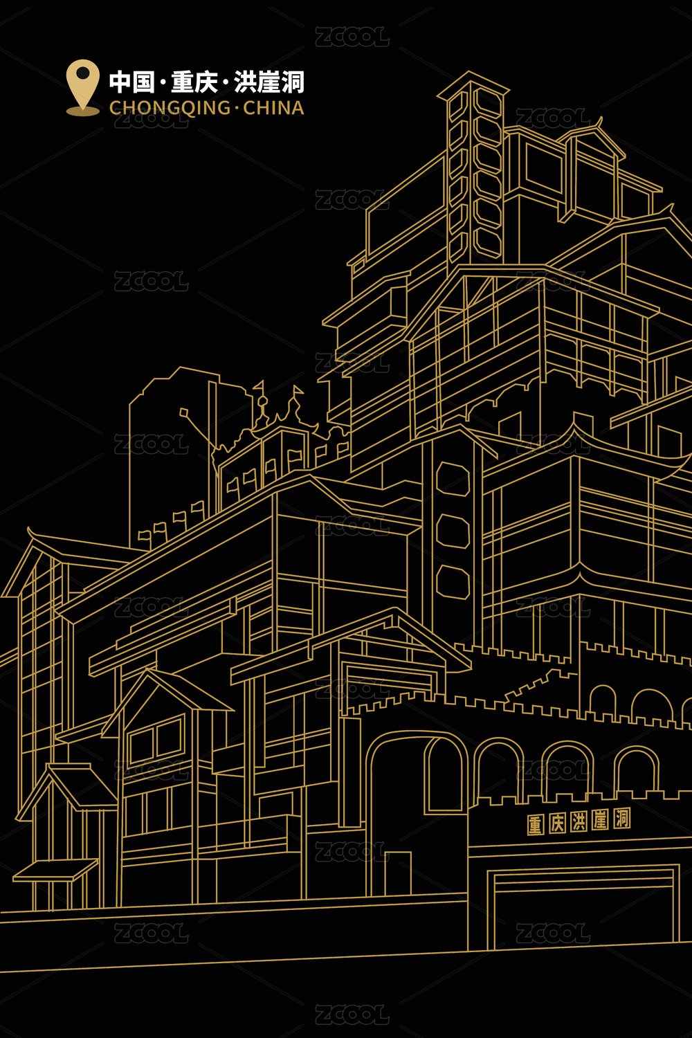 中國重慶城市地標(biāo)景點(diǎn)洪崖洞矢量圖
