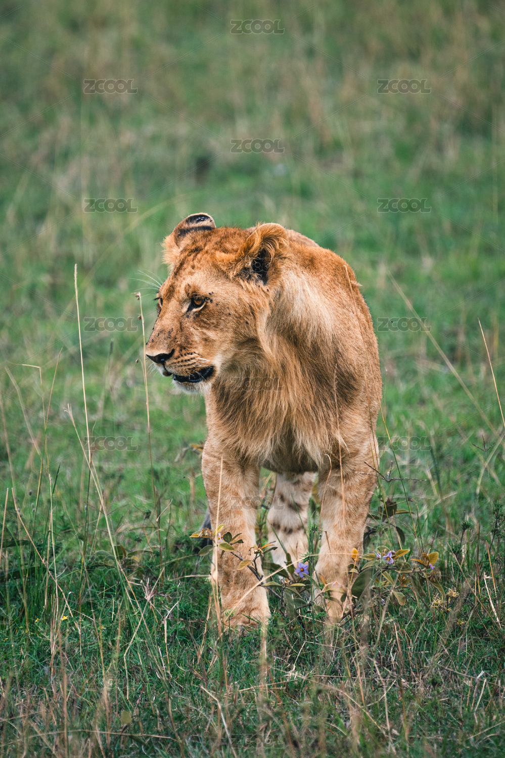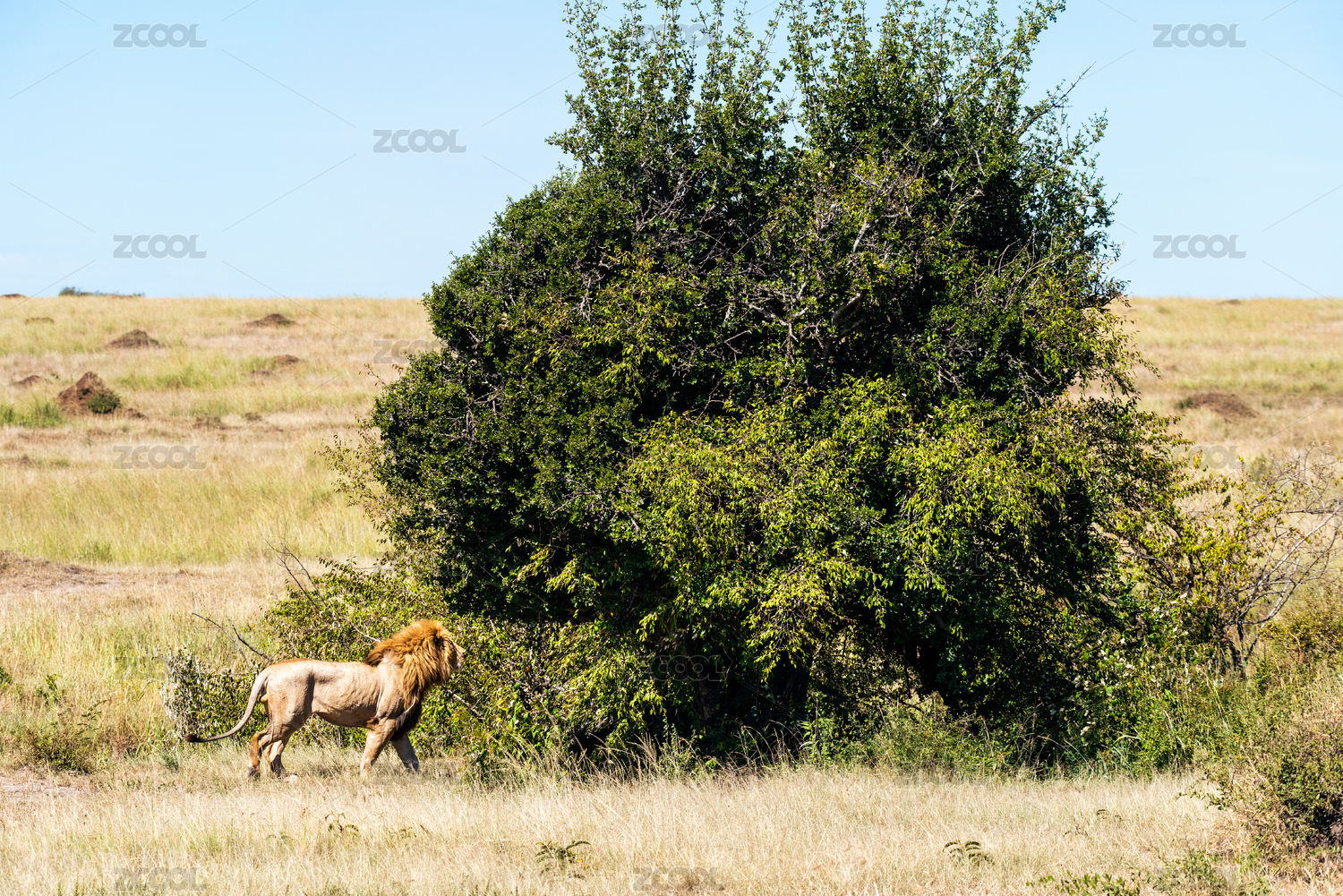 非洲肯尼亞馬賽馬拉草原上上一只雄獅正在走向灌木叢