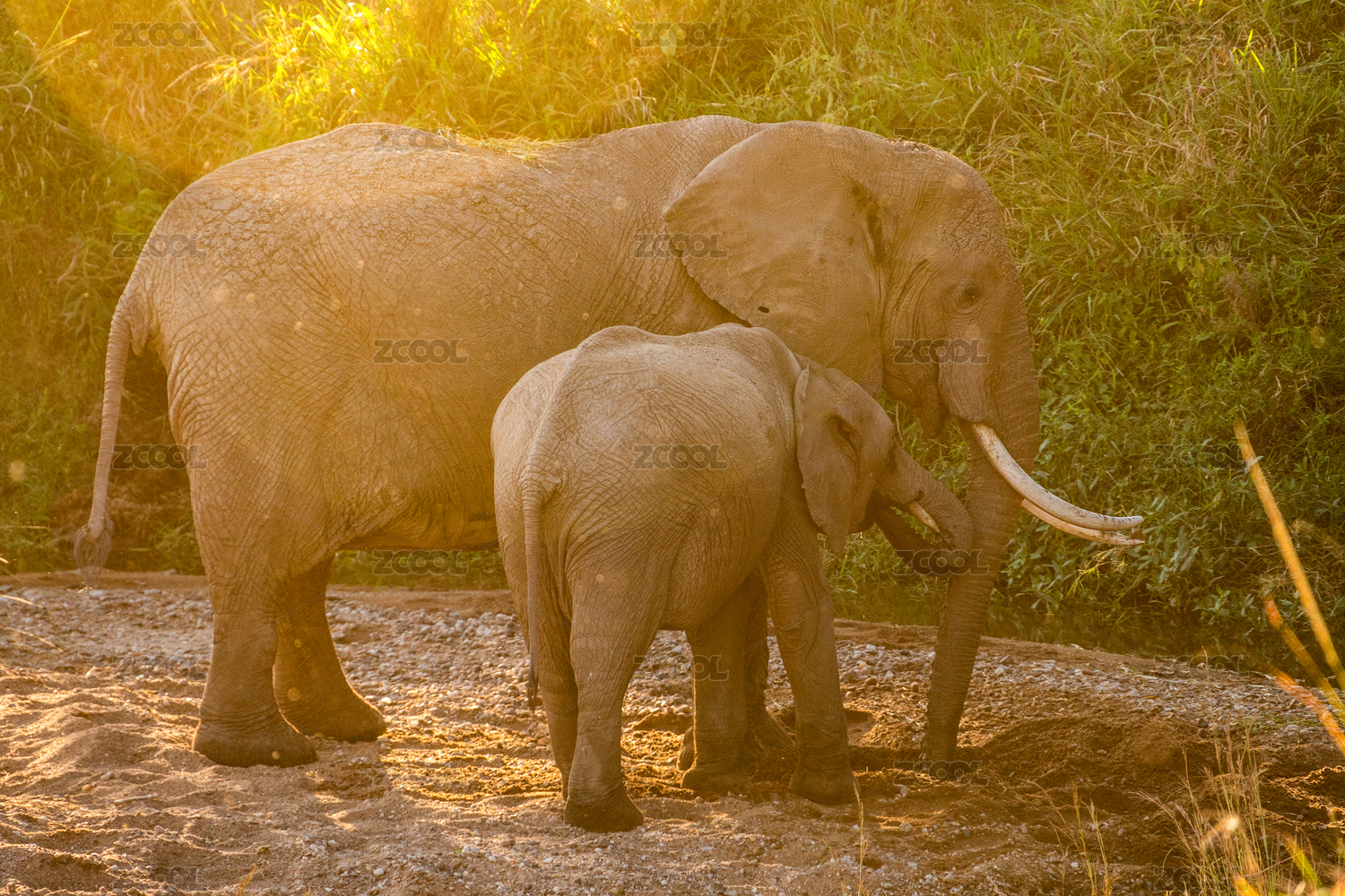 非洲肯尼亞馬賽馬拉草原夕陽下非洲象母子