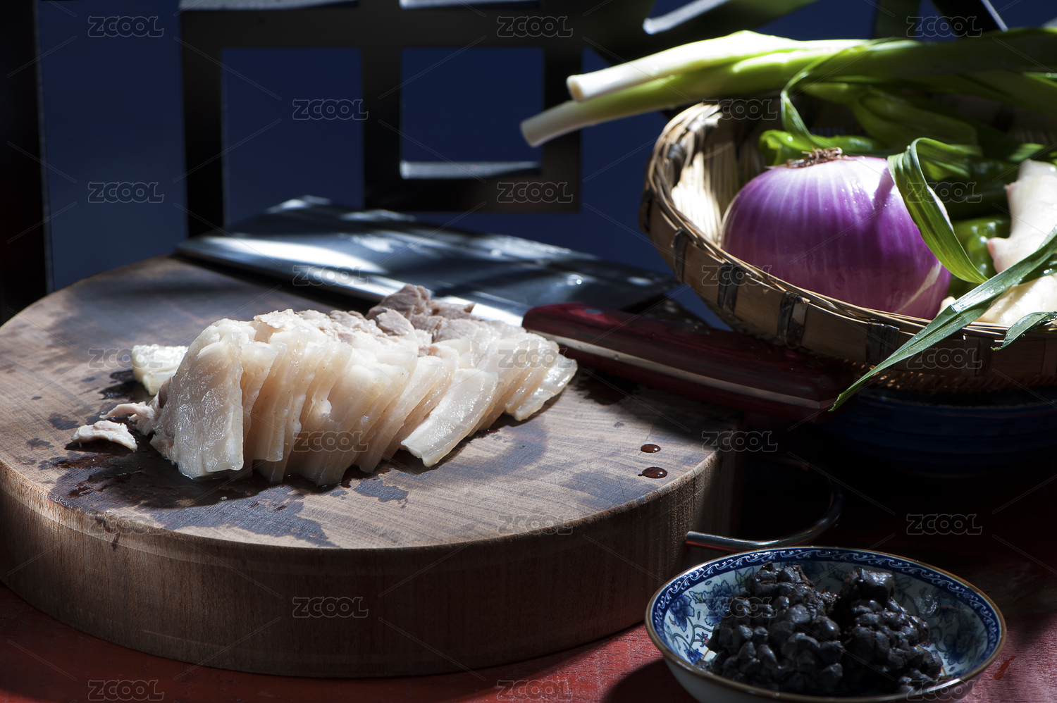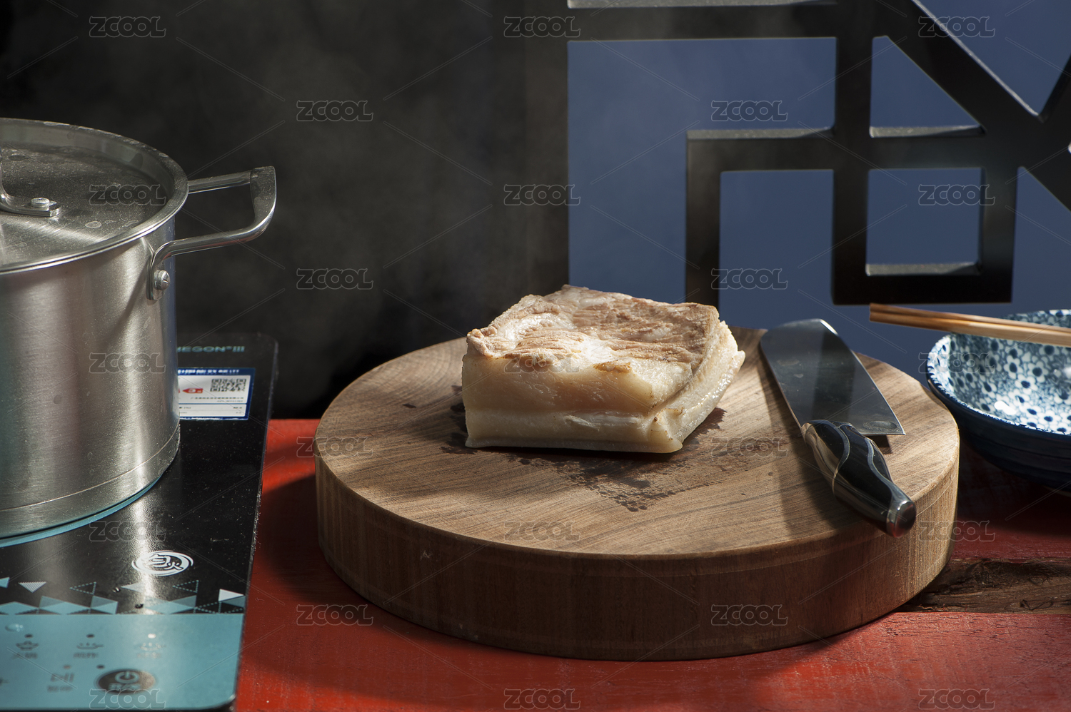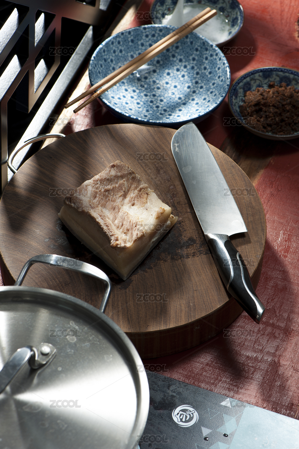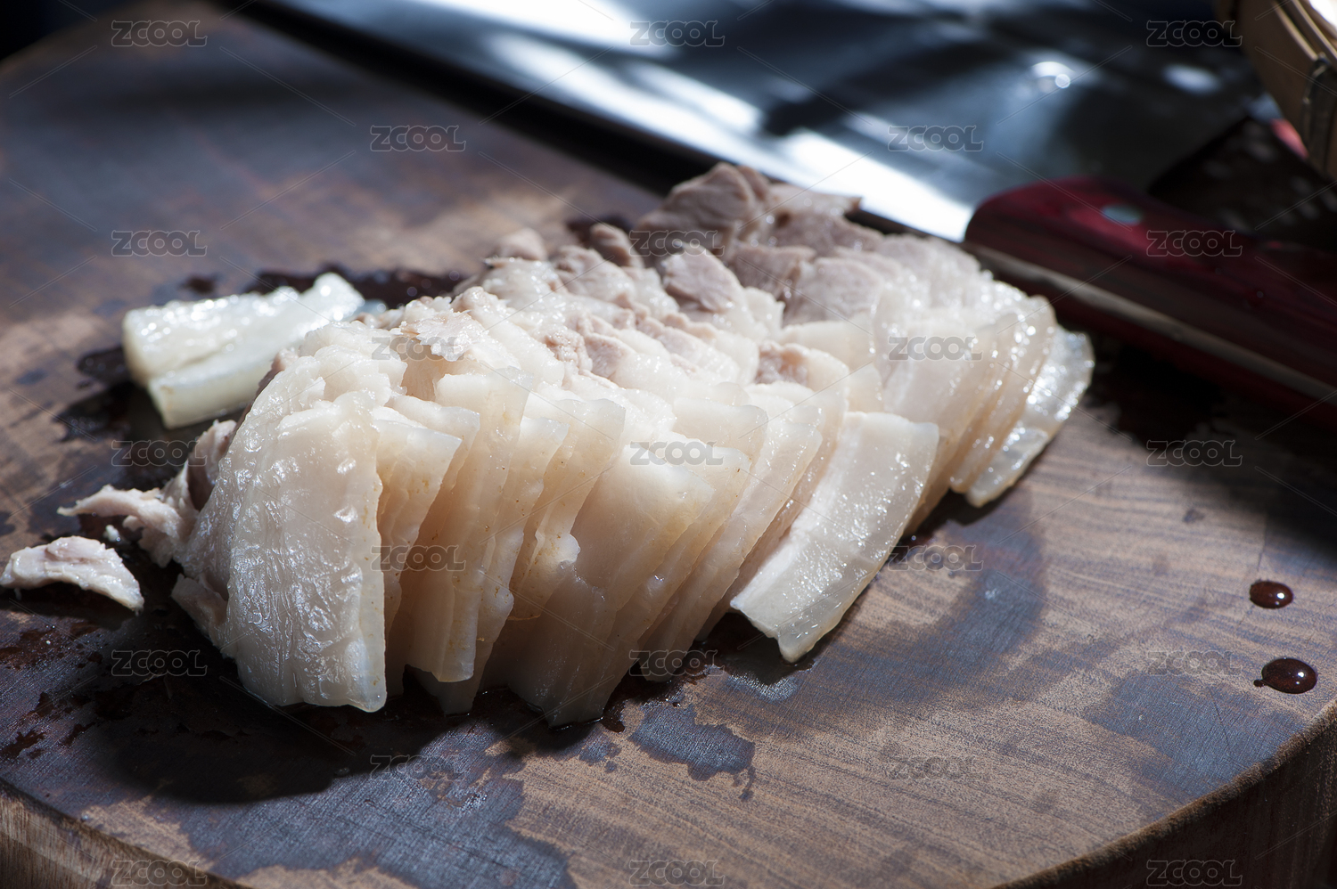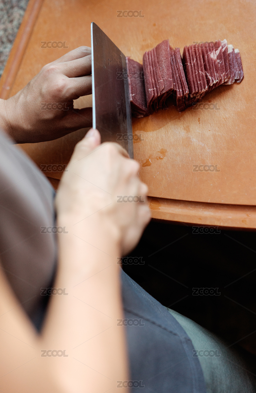正在用菜刀切牛肉的手部特寫