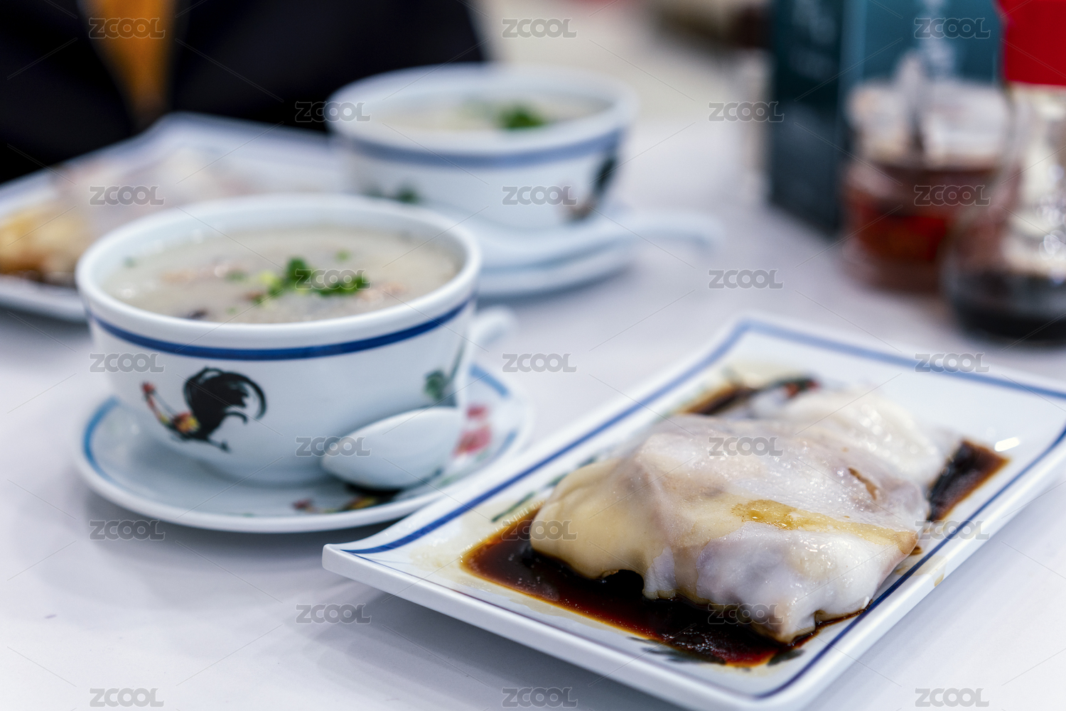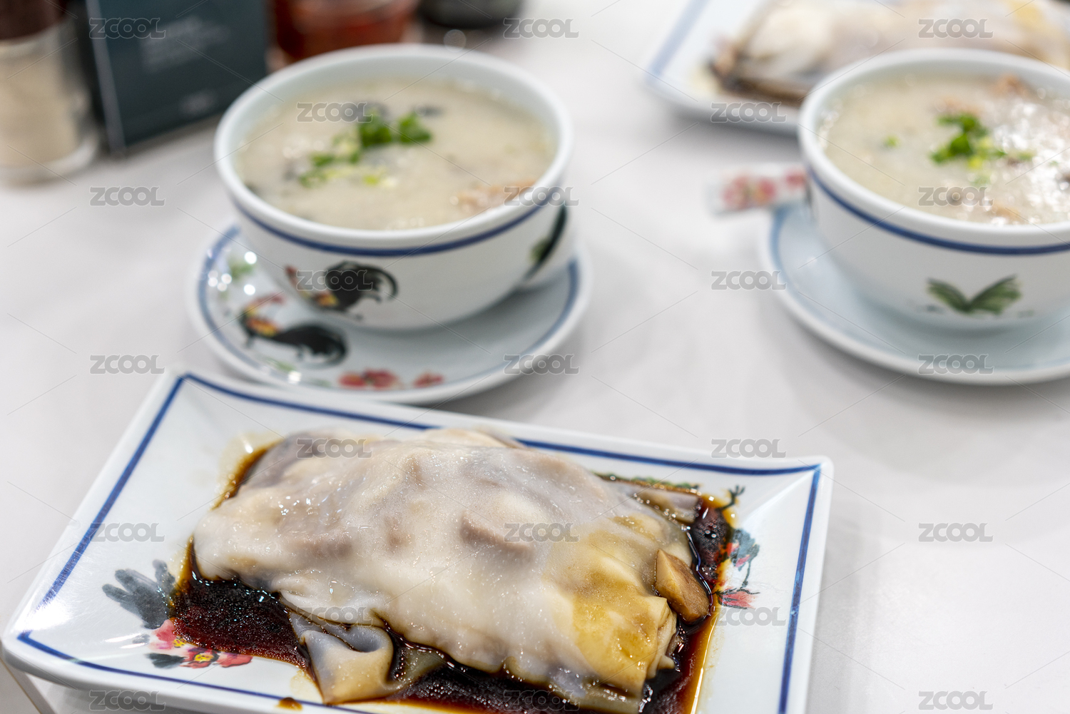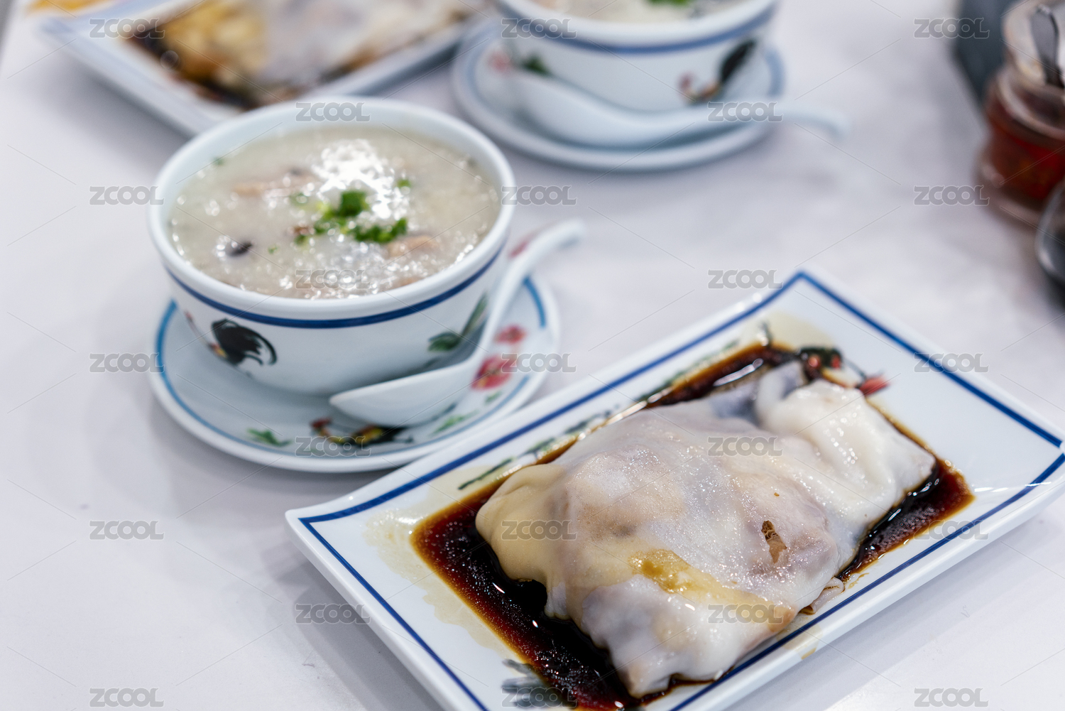 餐桌上的皮蛋瘦肉粥和腸粉