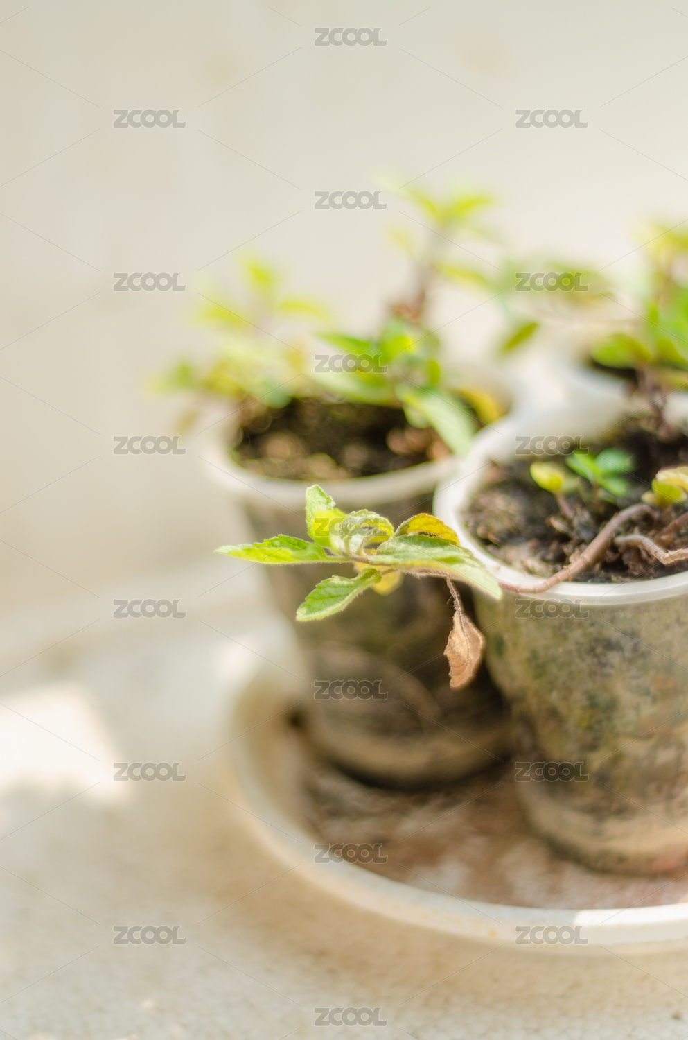 春天在陽(yáng)臺(tái)上剛長(zhǎng)出嫩葉的綠植