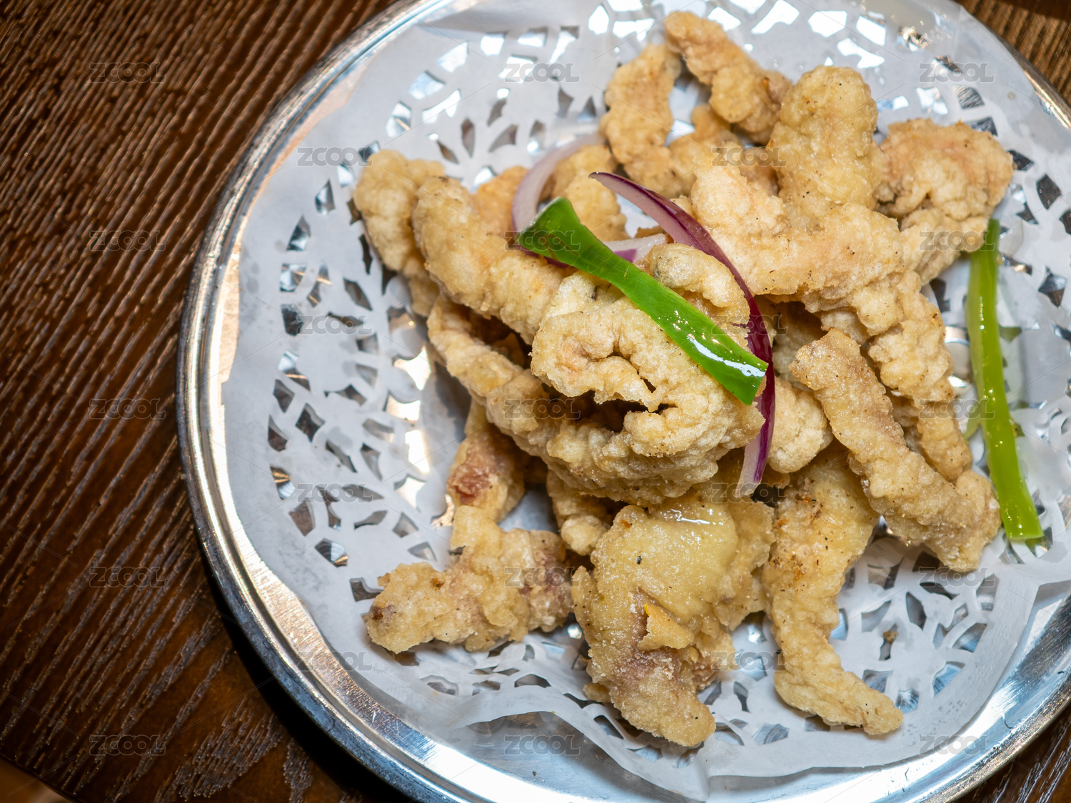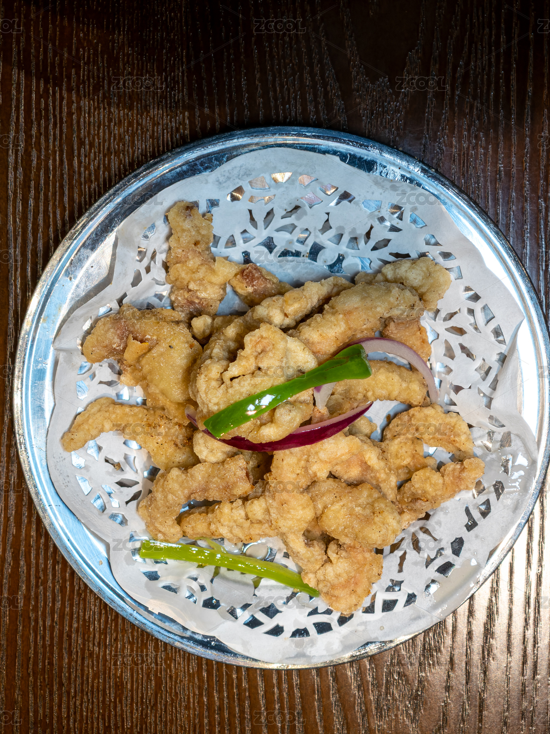 白盤里的現(xiàn)炸小酥肉配辣椒面