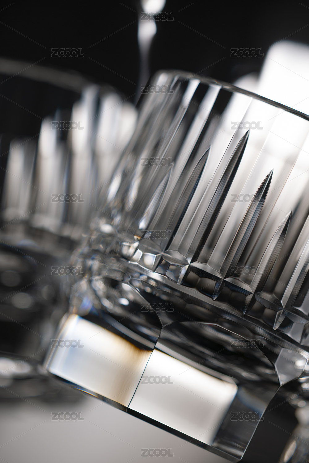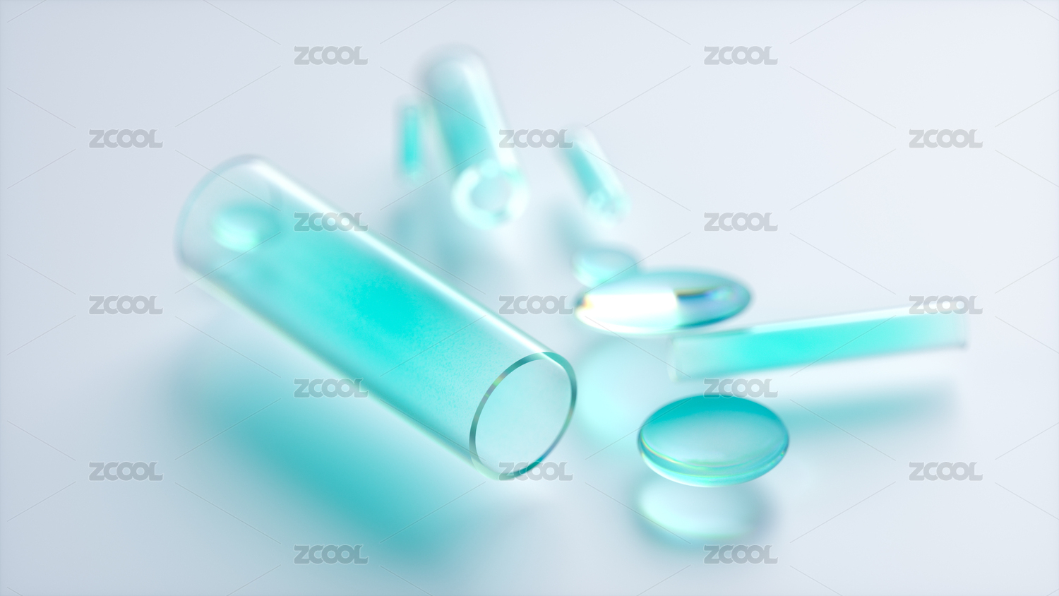 淺色背景中的透光青色玻璃器皿堆3D渲染