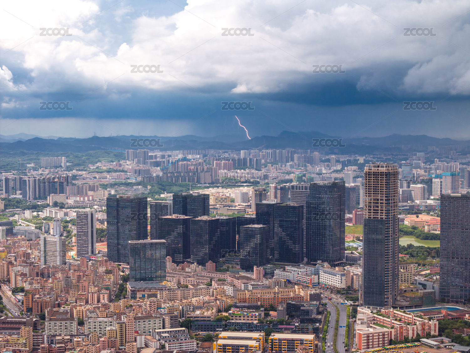 廣東深圳龍崗天安云谷雷雨天氣航拍