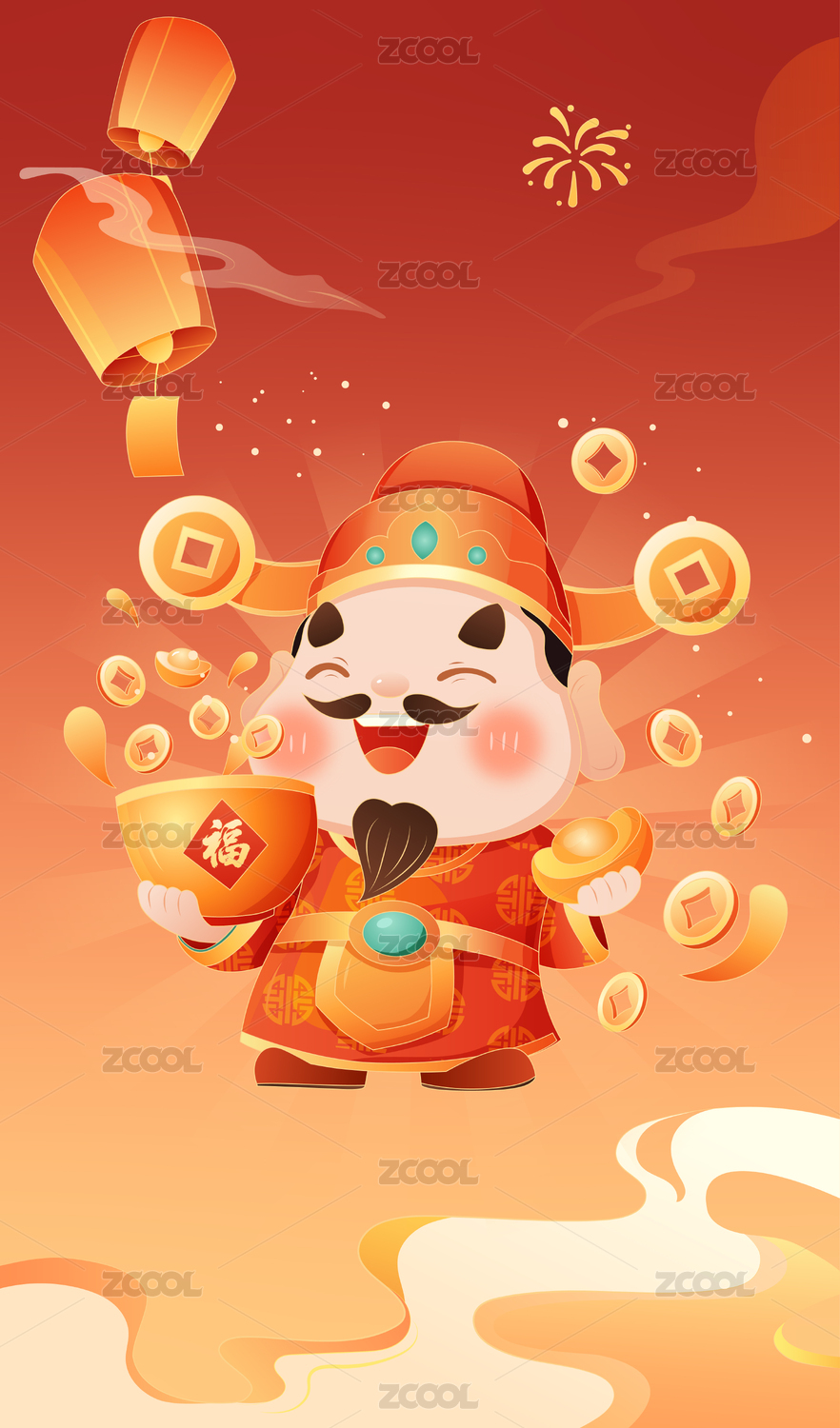抱著金元寶的財(cái)神人物插畫(huà)