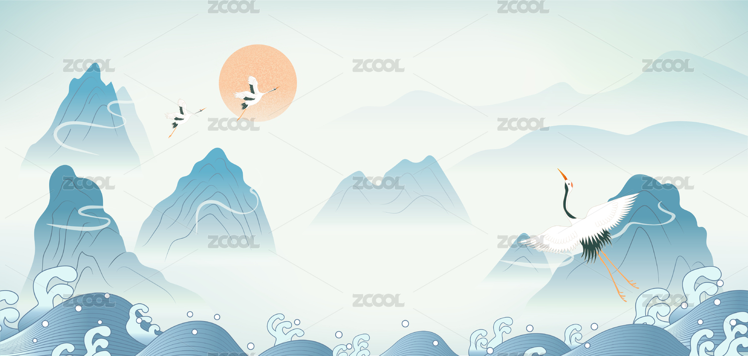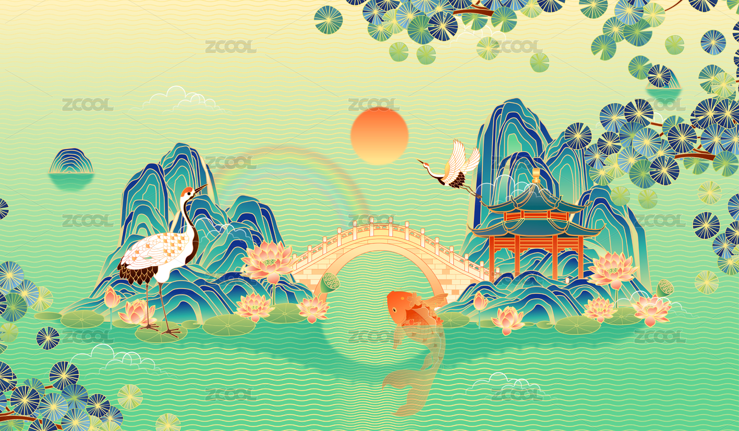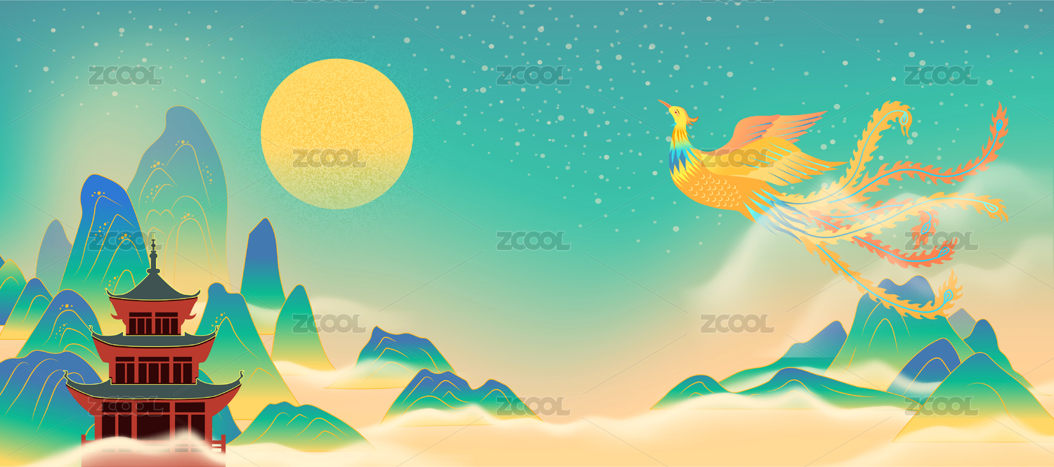 新中式國潮中國風(fēng)青綠山水鳳凰矢量插畫