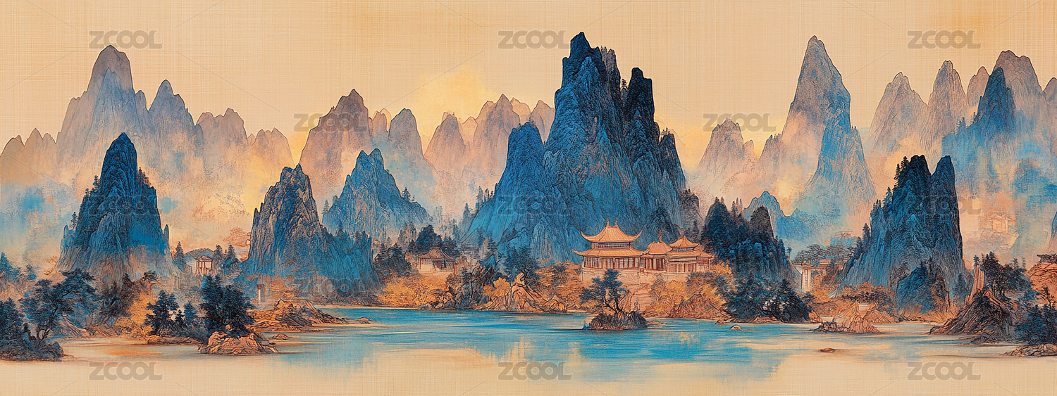 國風(fēng)國潮中國傳統(tǒng)青綠山水畫背景