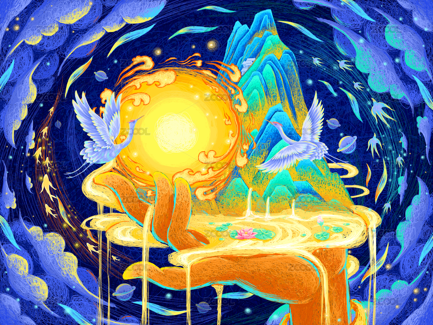 線圈國潮元宇宙青綠仙境插畫高清大圖