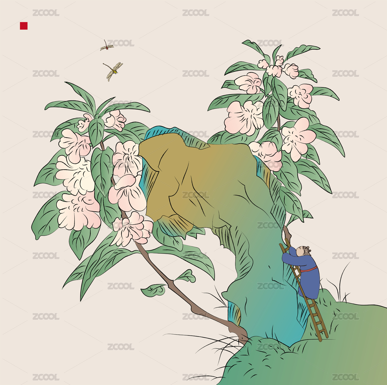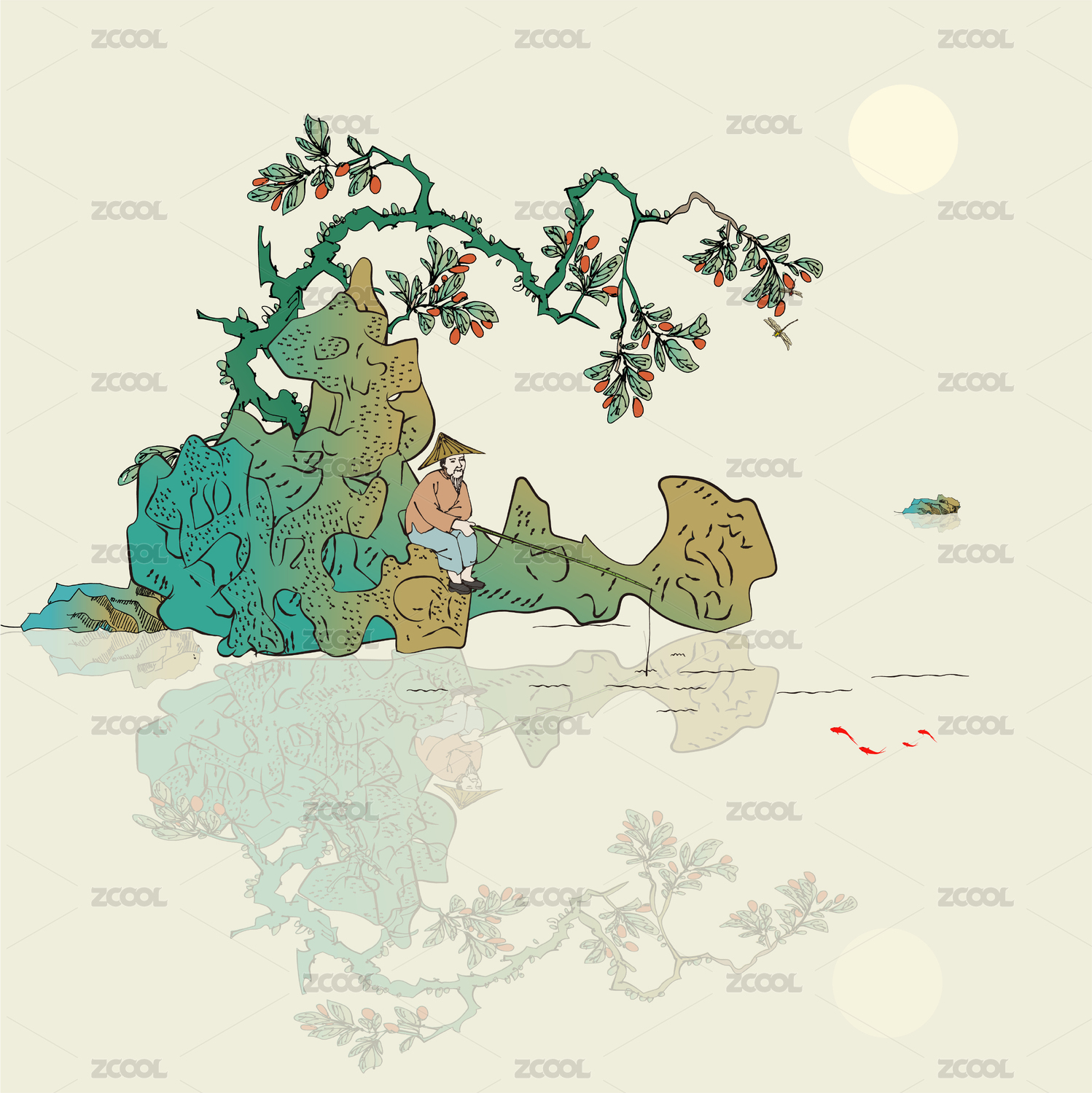 枸杞樹釣魚盆景中國風(fēng)矢量插畫