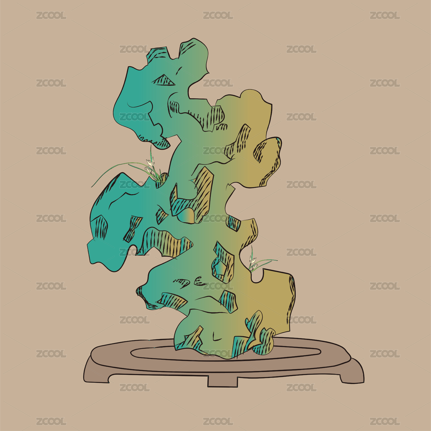 青綠假山蘭花盆景矢量中國風(fēng)插圖
