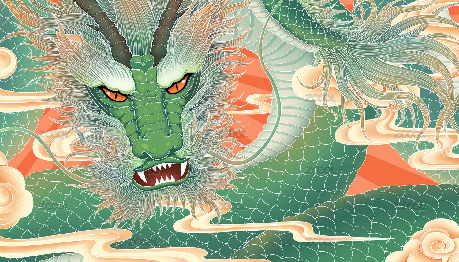 國潮中國風(fēng)青綠色的中國龍手繪插畫