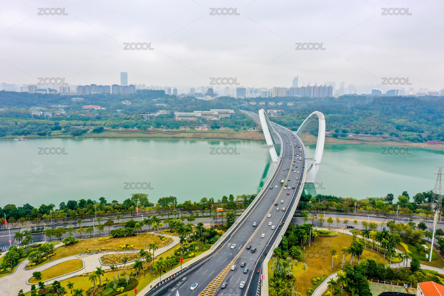 中國(guó)廣西南寧邕江上的良慶大橋遠(yuǎn)景航拍圖