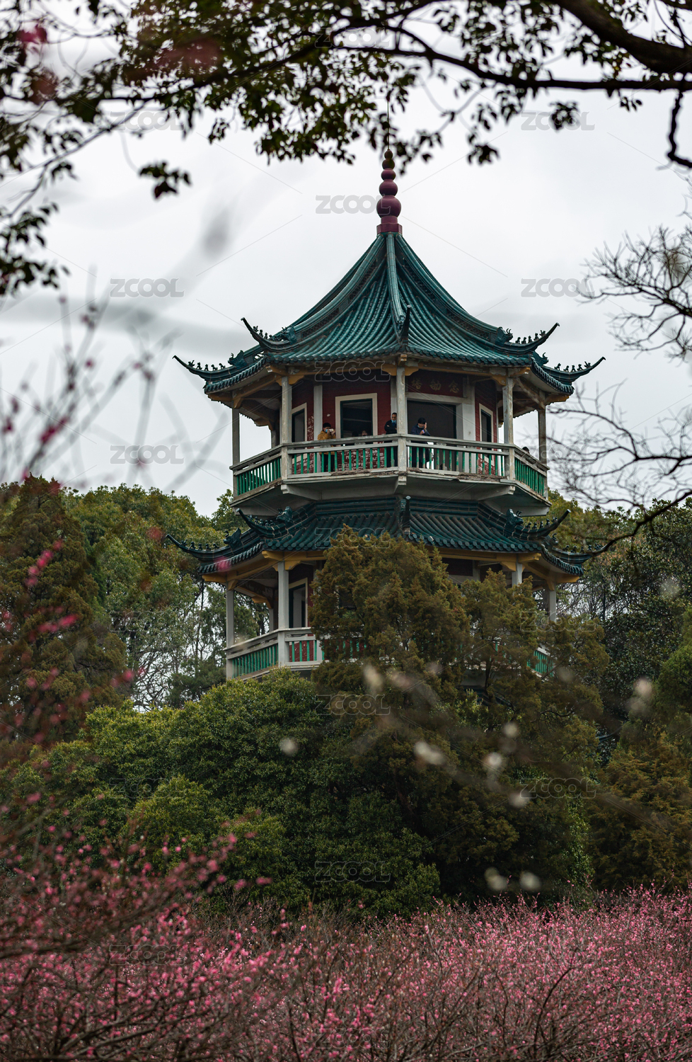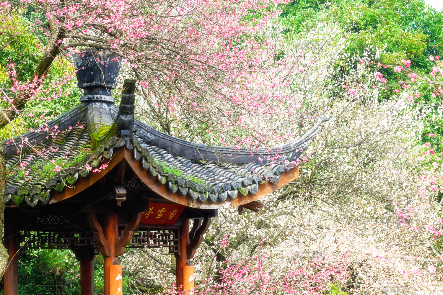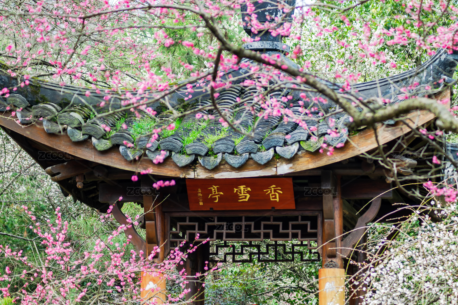 中國浙江杭州植物園靈峰探梅香雪亭與梅花