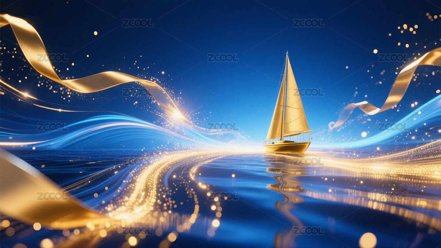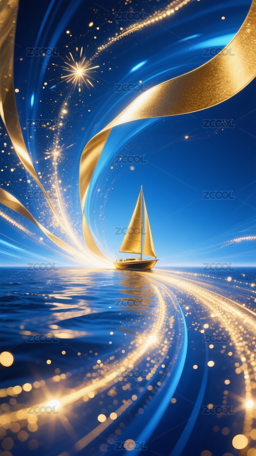 金色帆船夢幻海景插畫