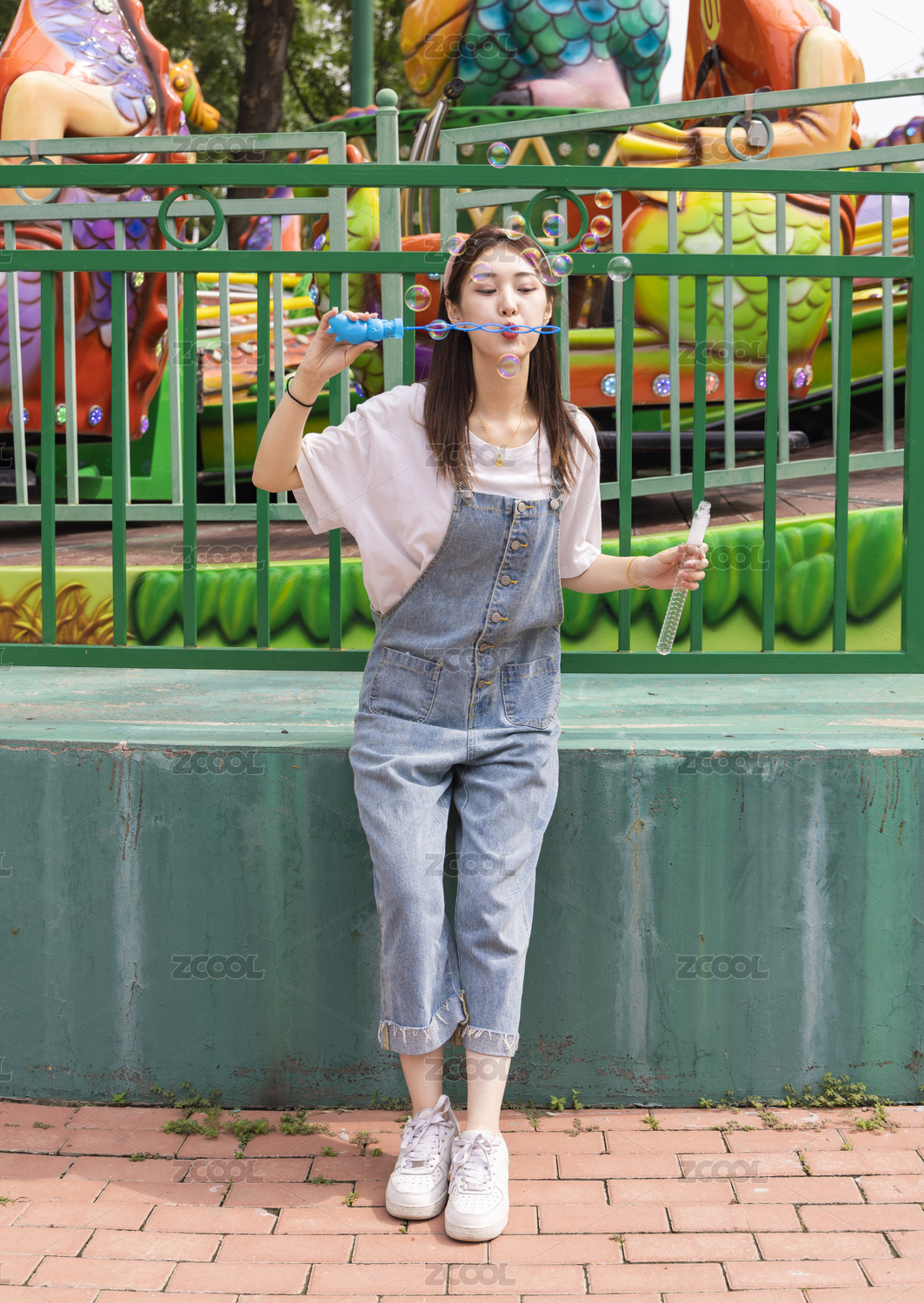 在游樂(lè)園里玩吹泡泡的美麗東方女孩
