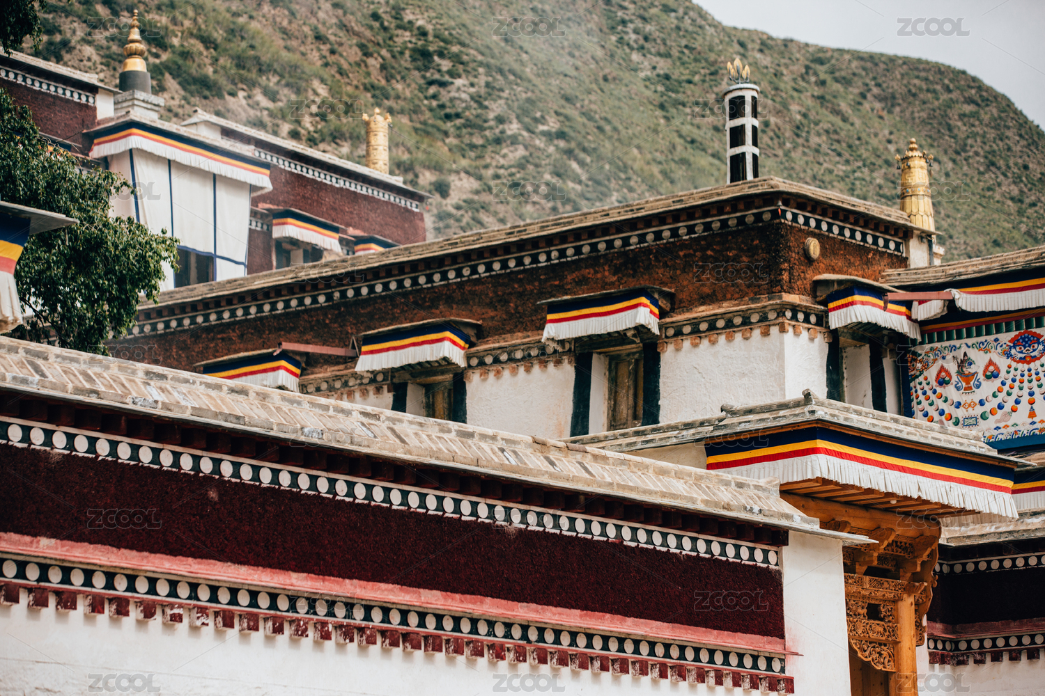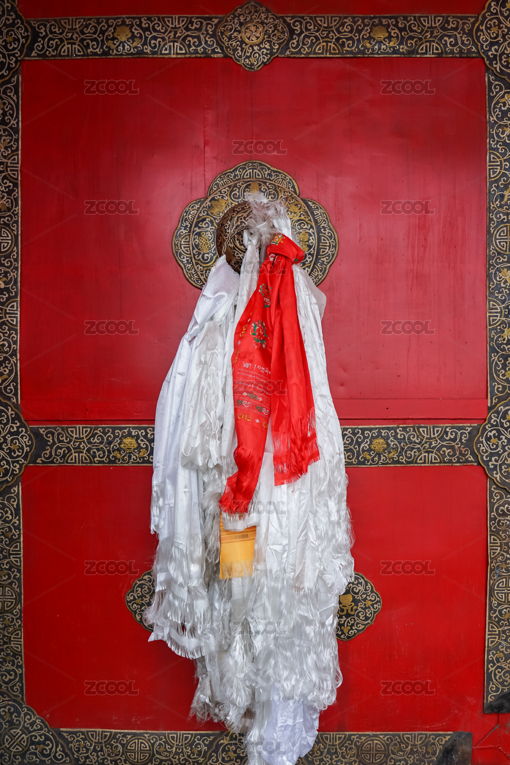 中國四川,塔公寺紅門上的哈達(dá)與經(jīng)幡裝飾