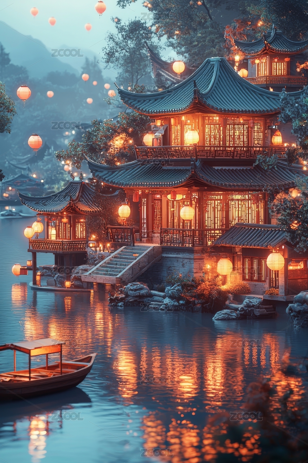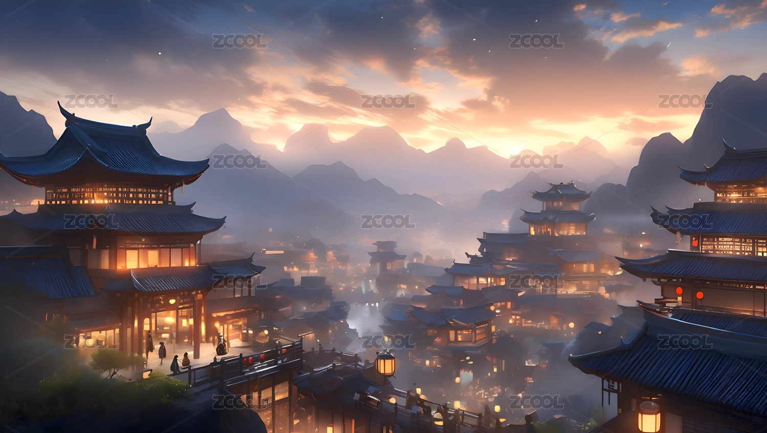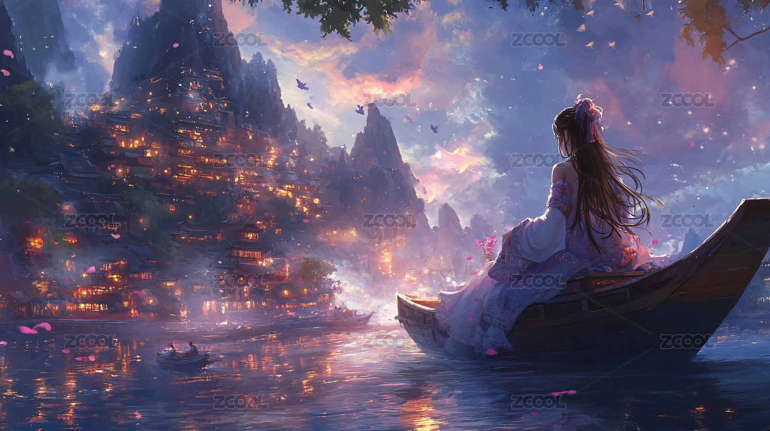 古裝女孩遠望中國城鎮(zhèn)節(jié)日燈火