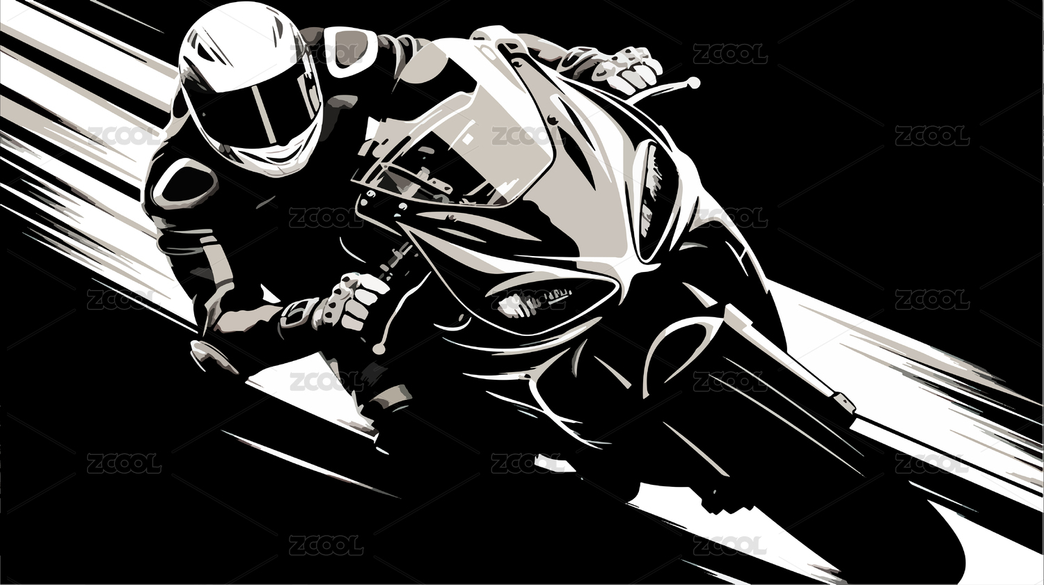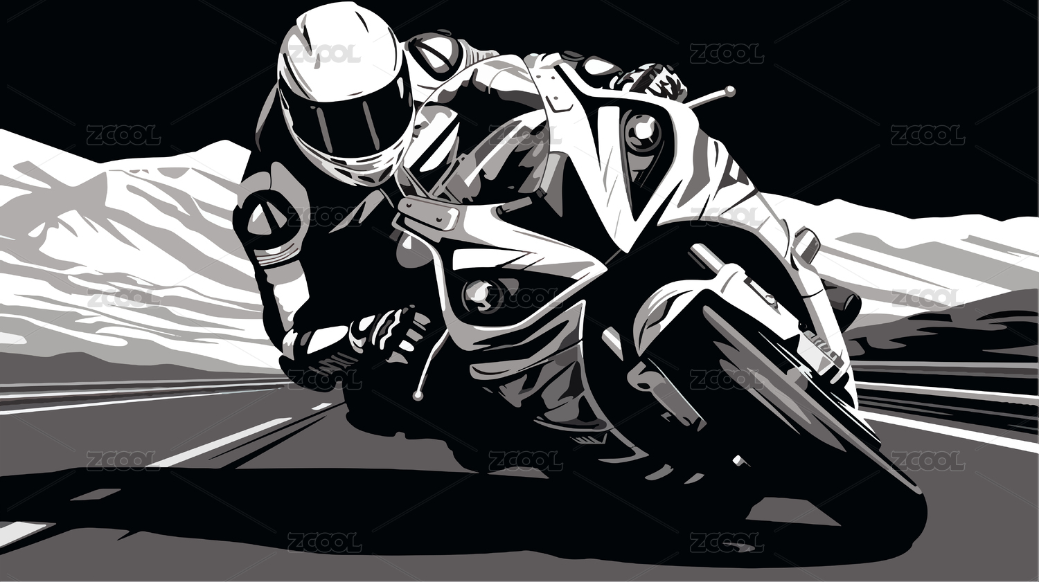 手繪卡通騎摩托車的賽車手黑白色插畫
