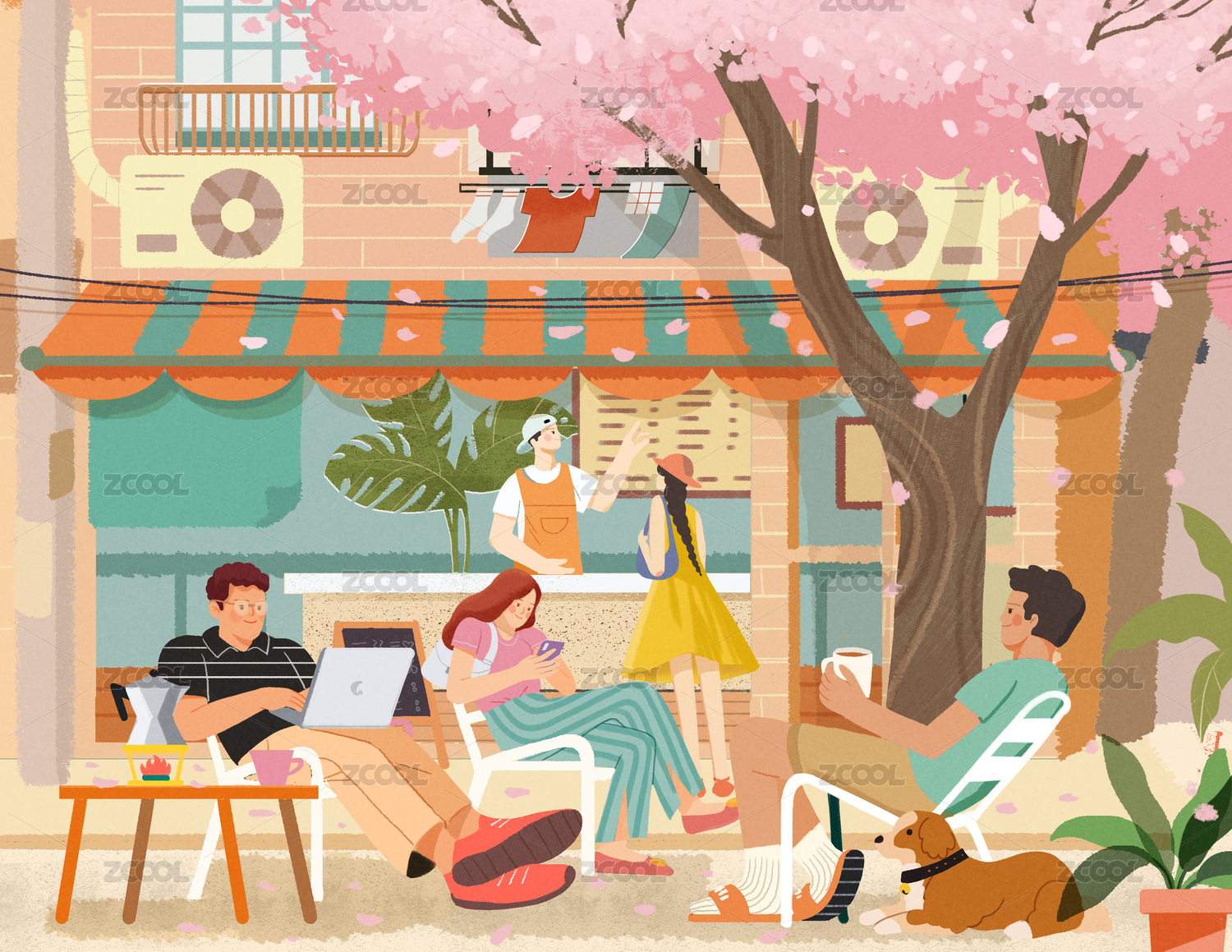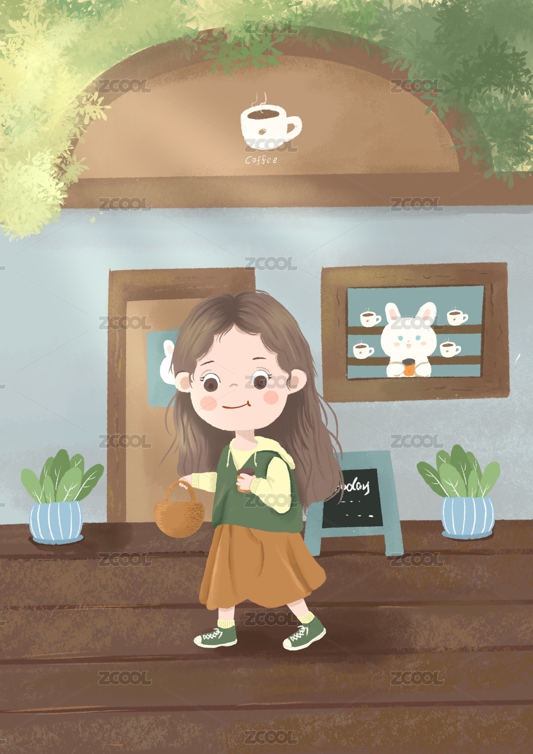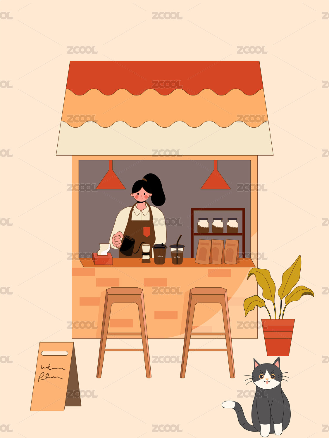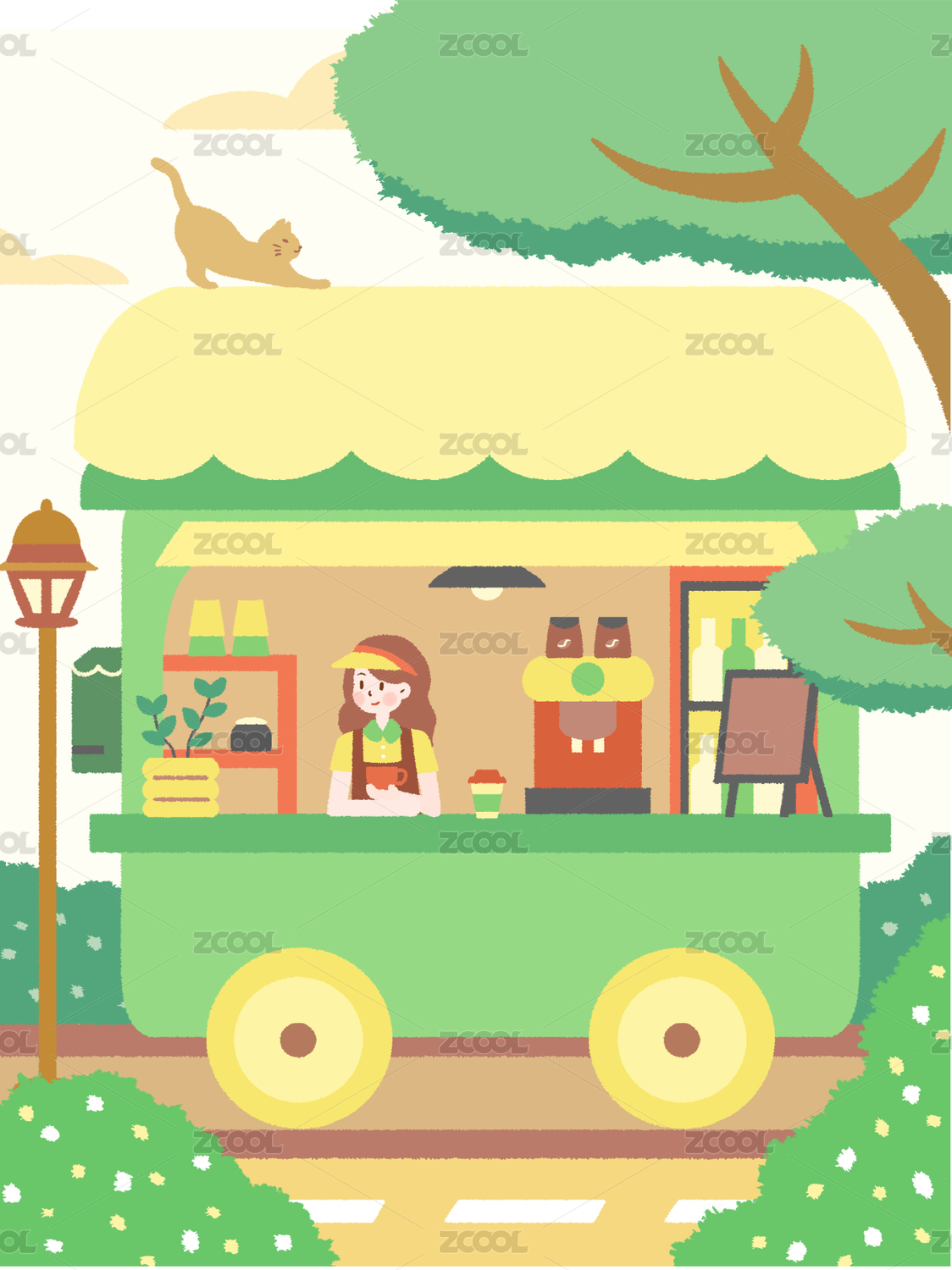 扁平小清新戶外室外咖啡店餐車女孩插畫