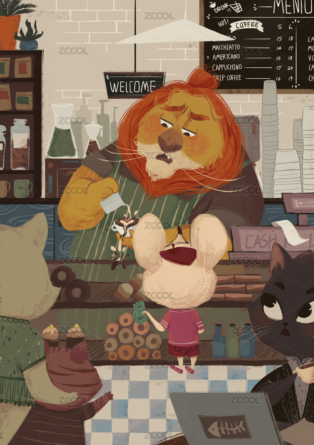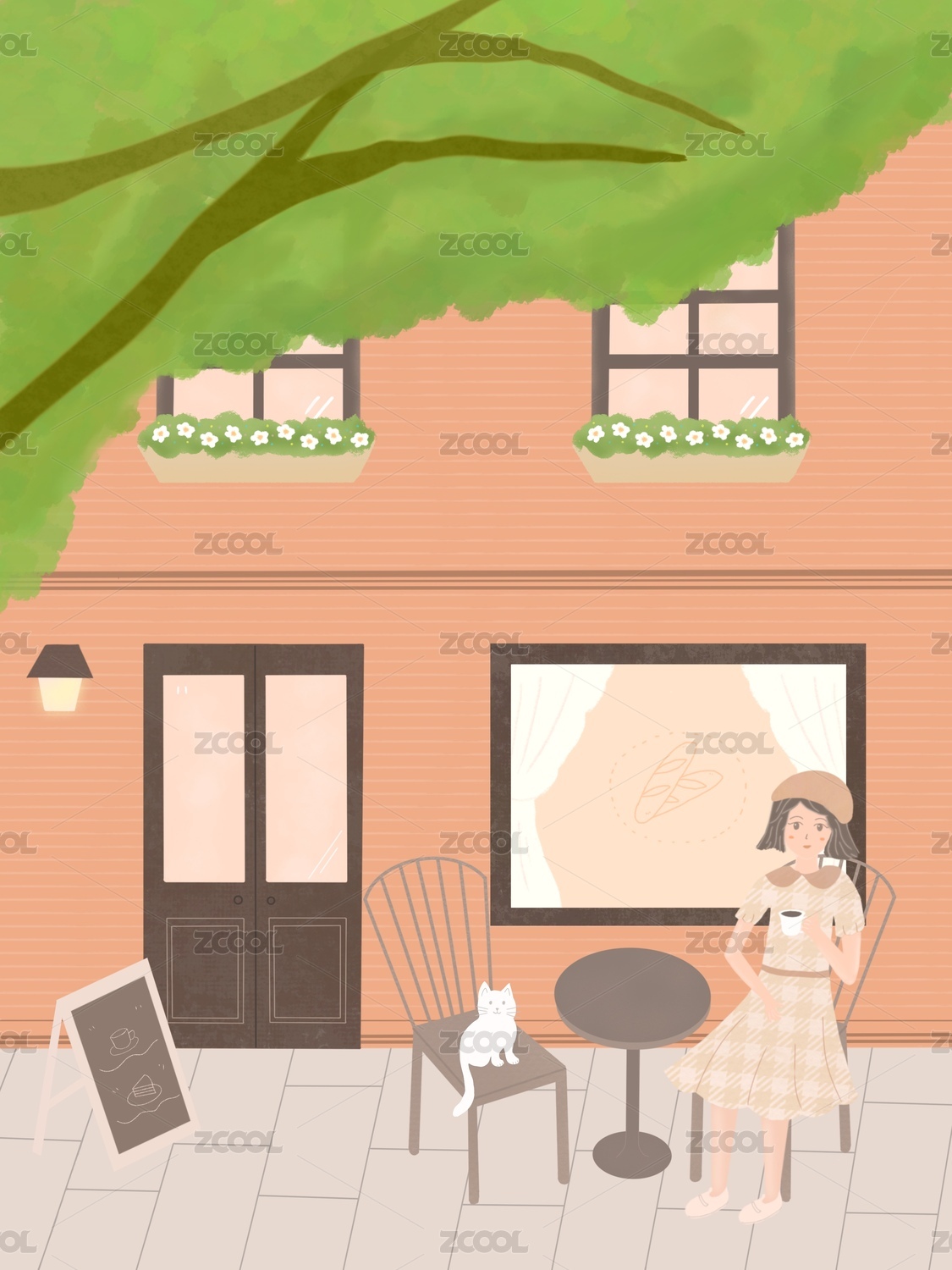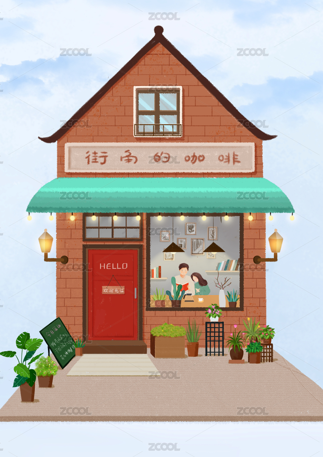 浪漫咖啡店復(fù)古建筑店鋪手繪插畫