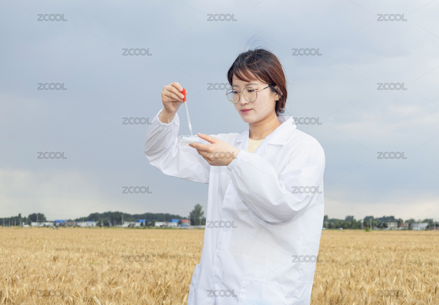 科研女性在農(nóng)田中使用玻璃器具做實驗