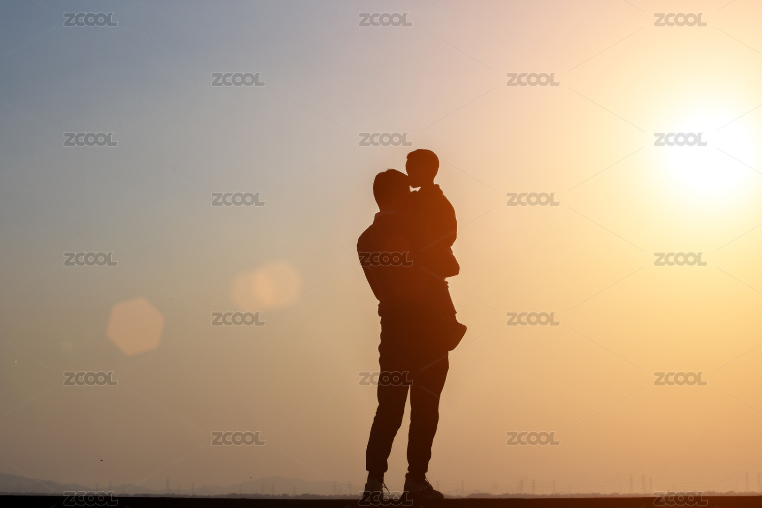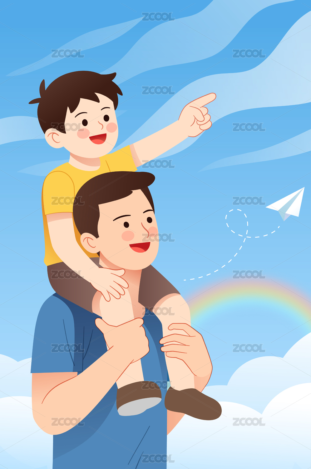 藍(lán)天下一個(gè)孩子坐在爸爸肩上并手指前方