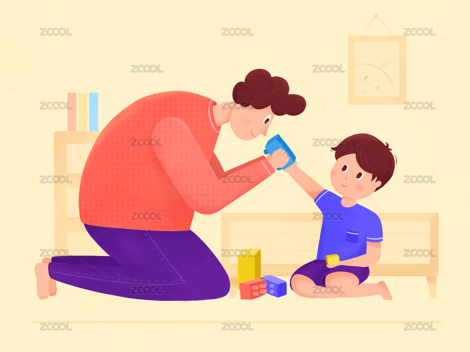 父親與孩子在家中玩拼圖游戲互動(dòng)插圖