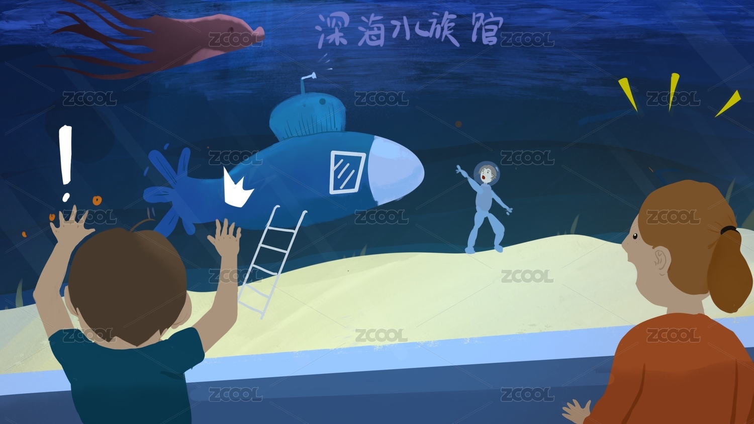 在深夜水族館中隔著玻璃興奮的孩子們 插畫