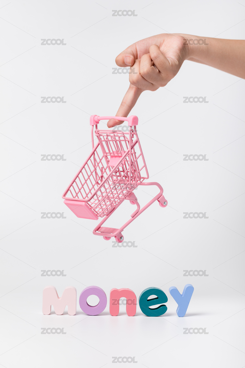 money字母上方一只手勾著粉色少女心購(gòu)物車