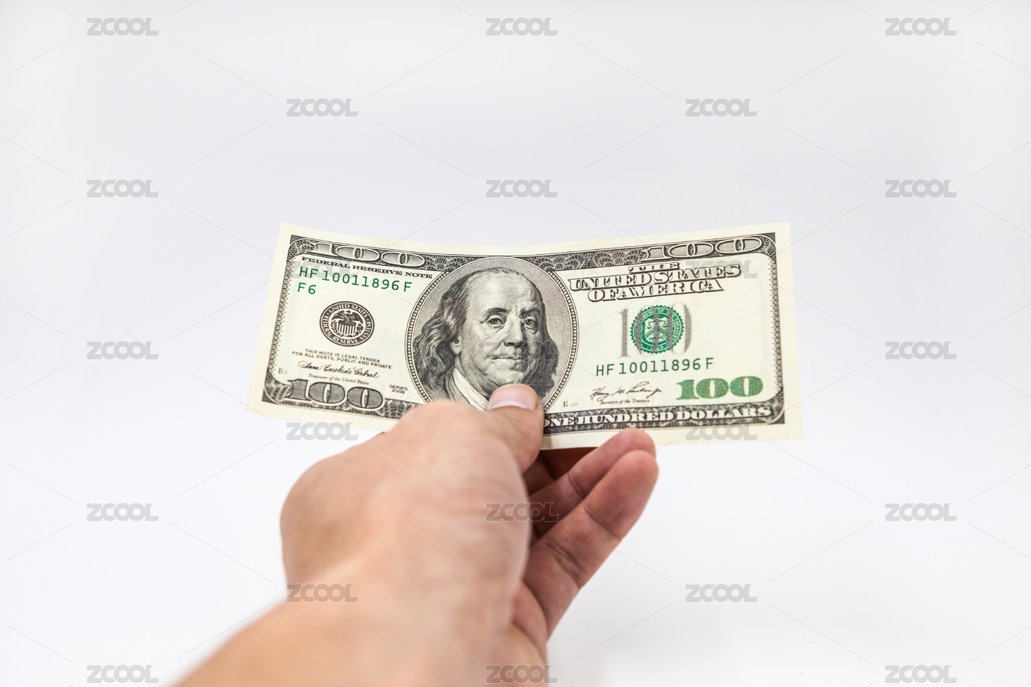 male hand holding money dollars, 100 US dollar banknote isolated on white background