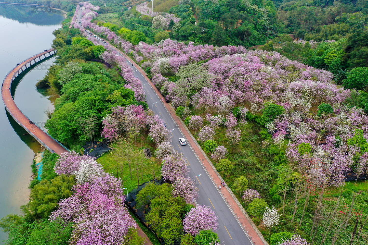 航拍廣西柳州春季城市紫荊花海生態(tài)宜居風光