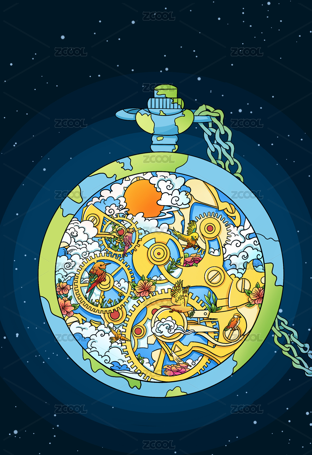 藍(lán)天地球懷表齒輪同構(gòu)插畫