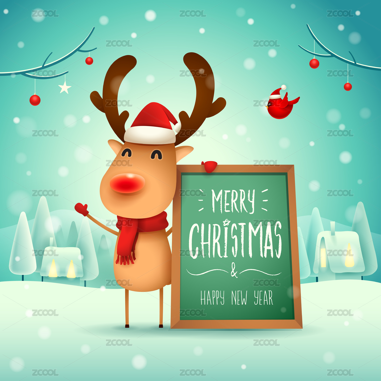 紅鼻子馴鹿與留言板圣誕雪景冬季景觀。
