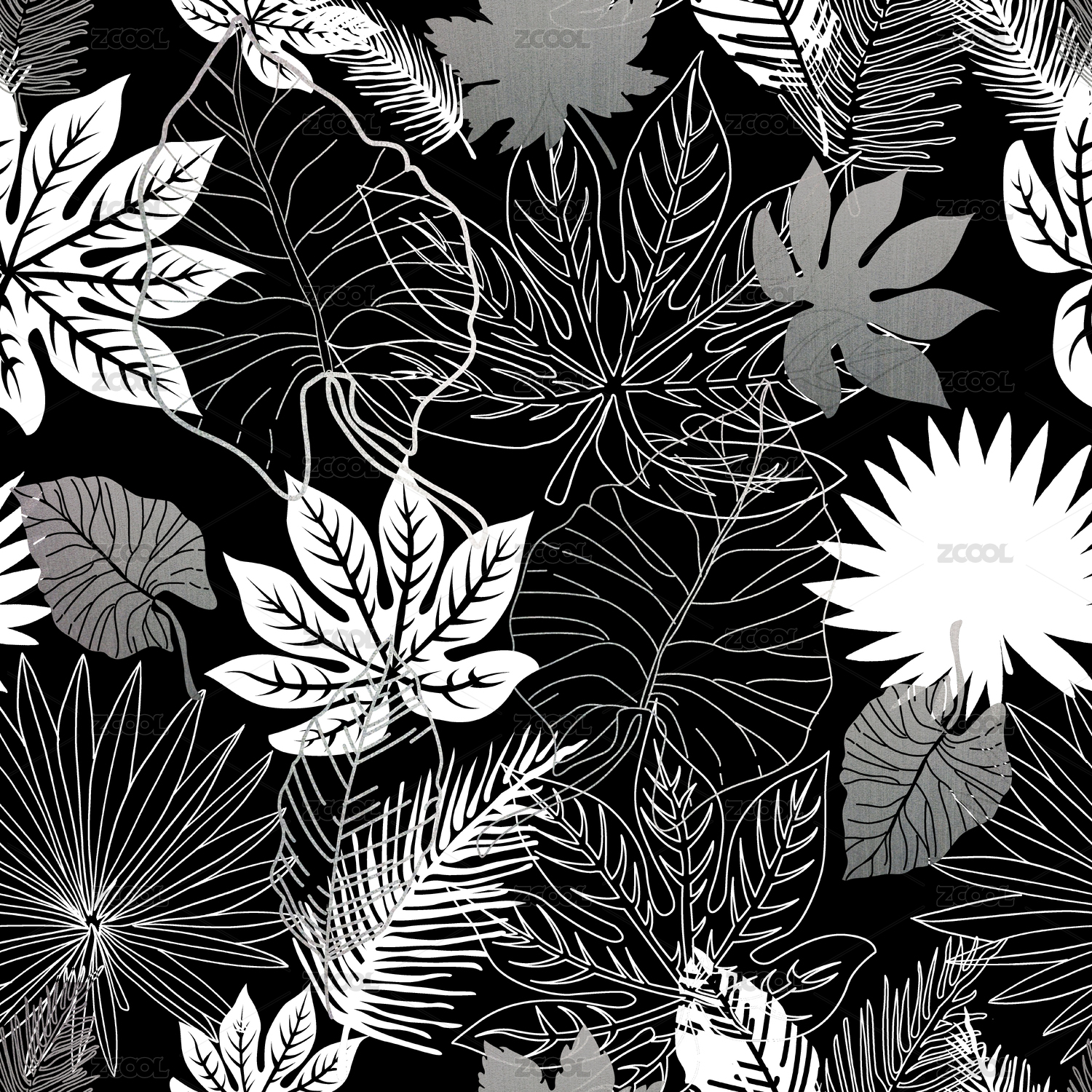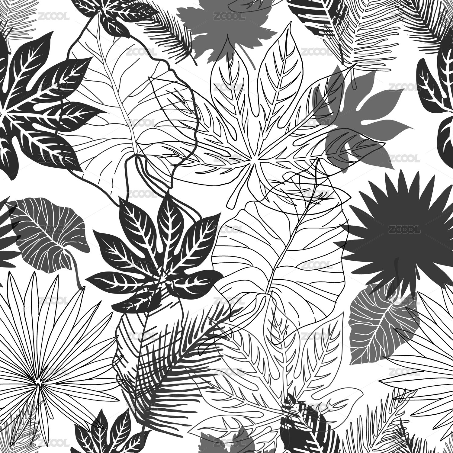 熱帶樹(shù)葉的無(wú)縫圖案。黑白手繪