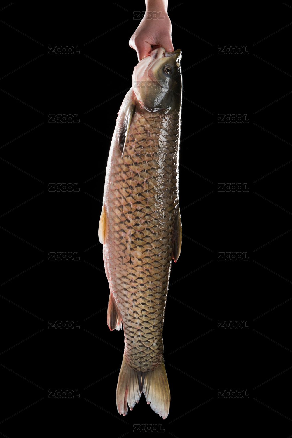 黑色背景上手拿一條草魚